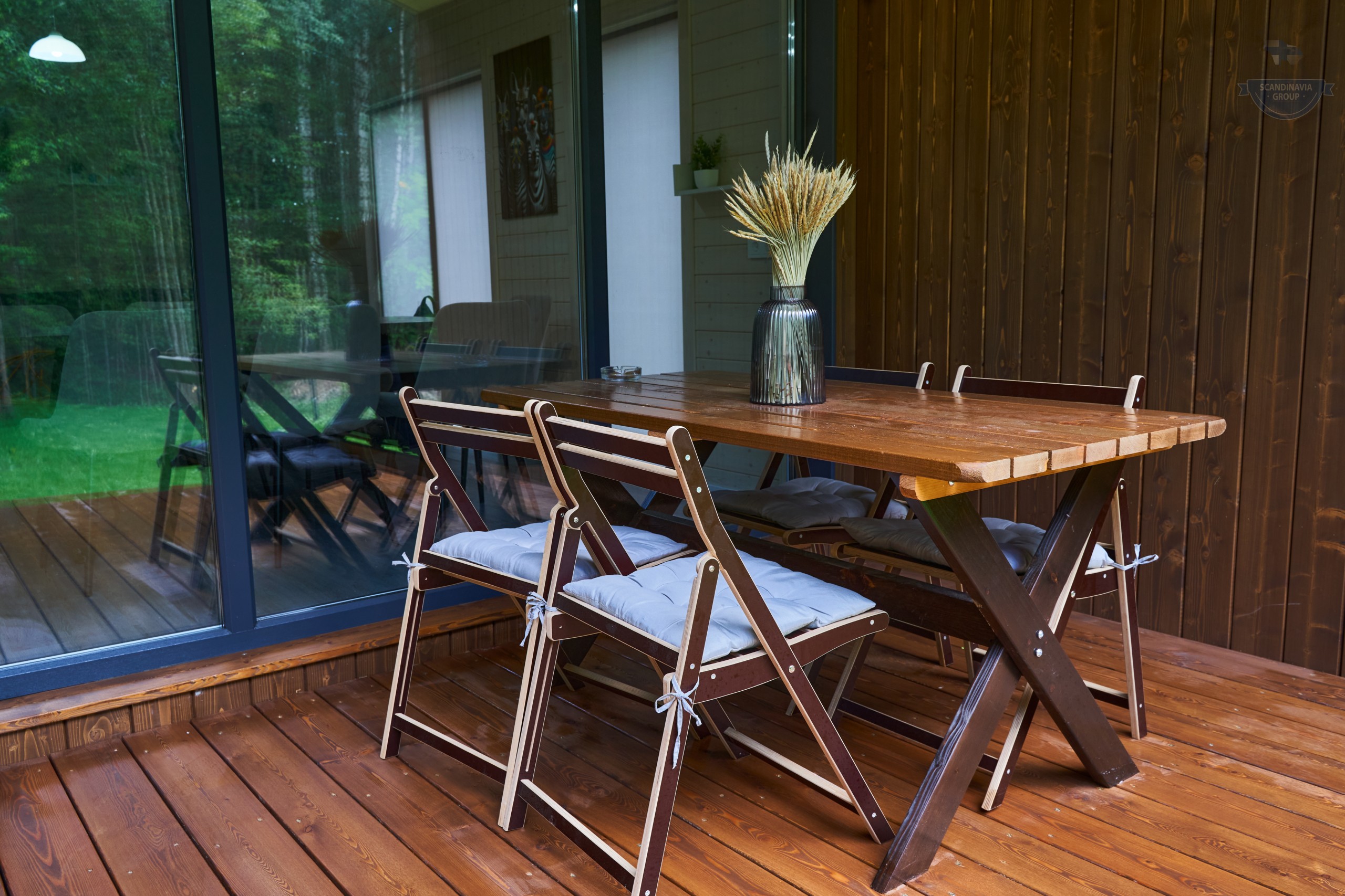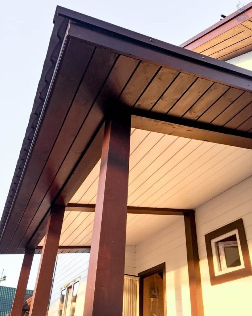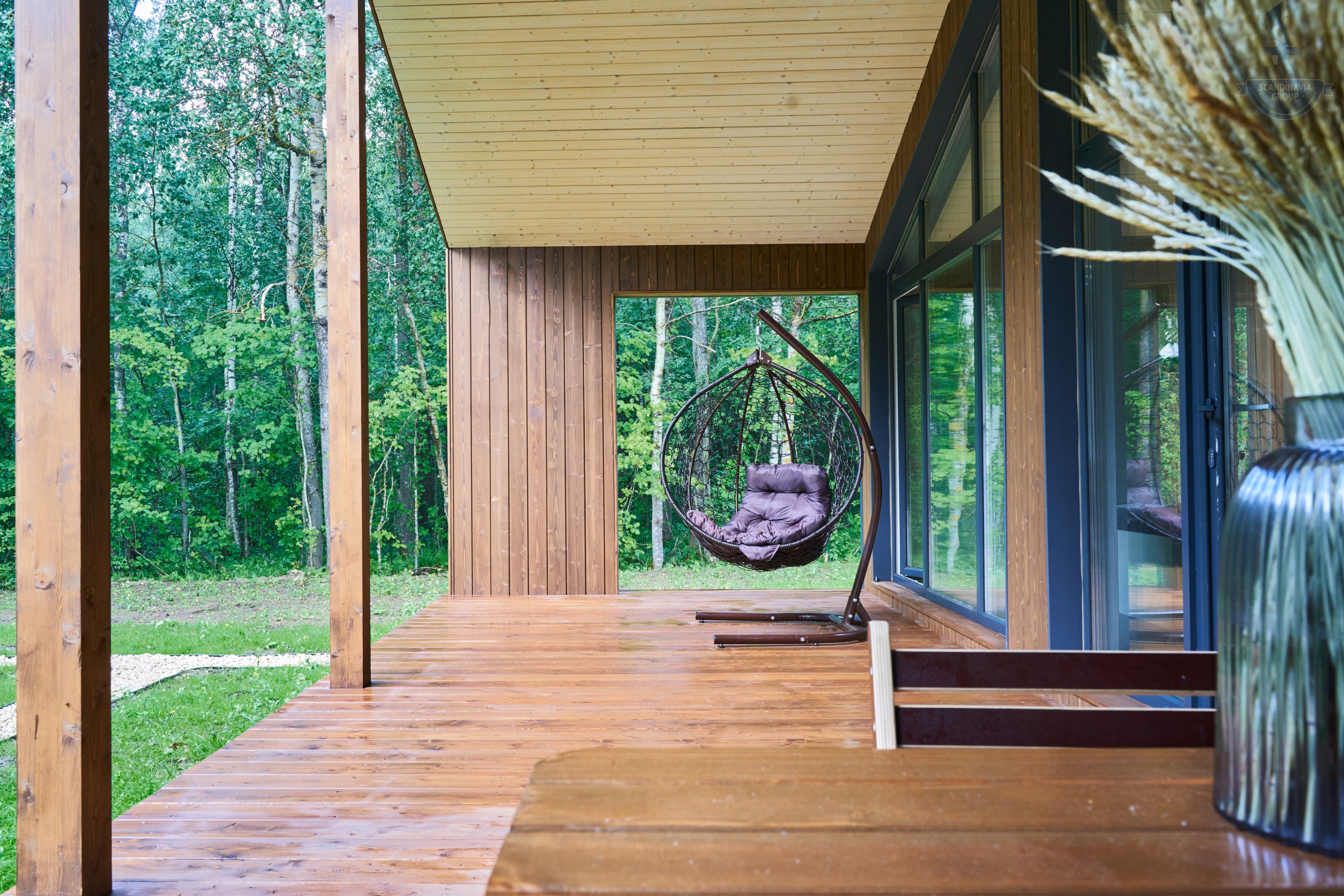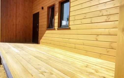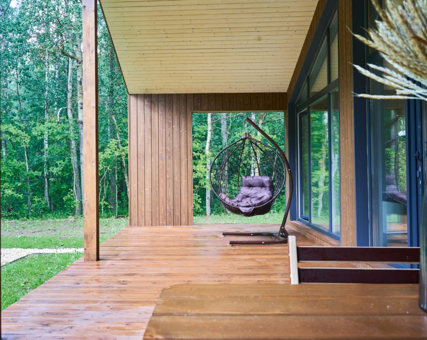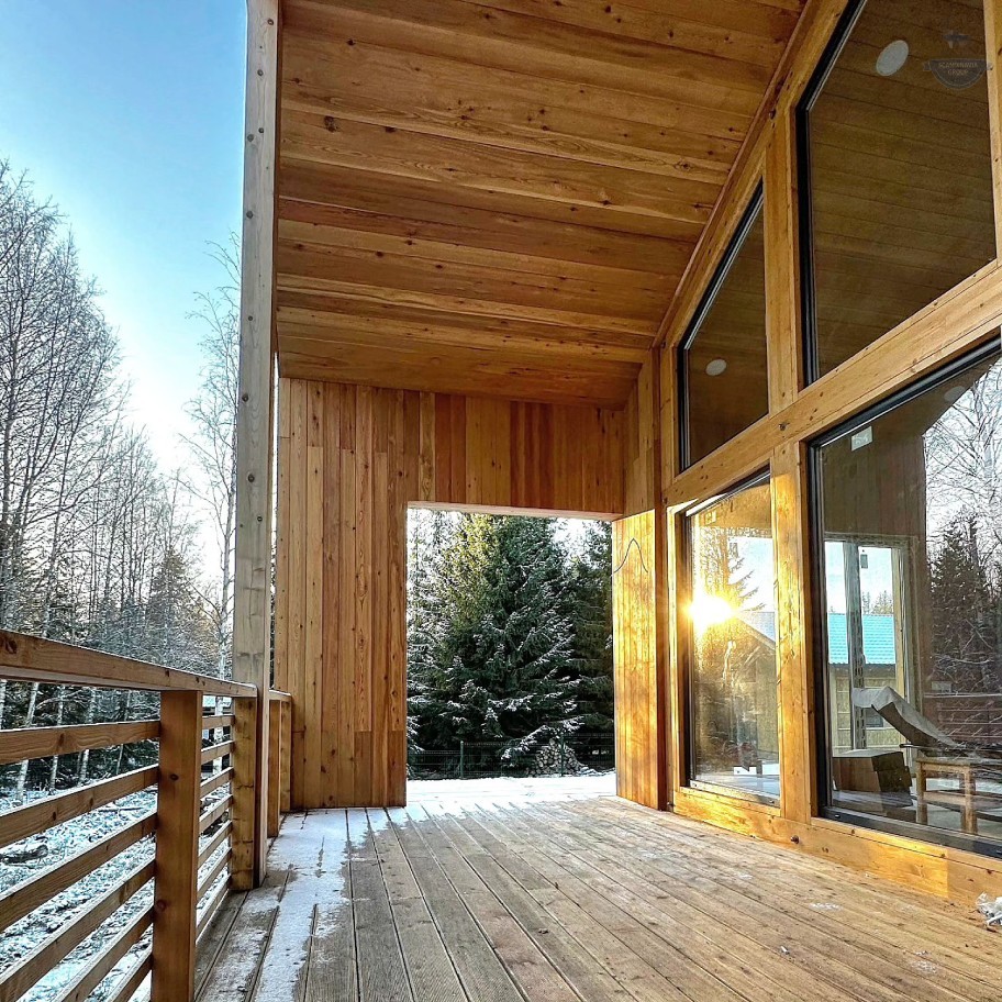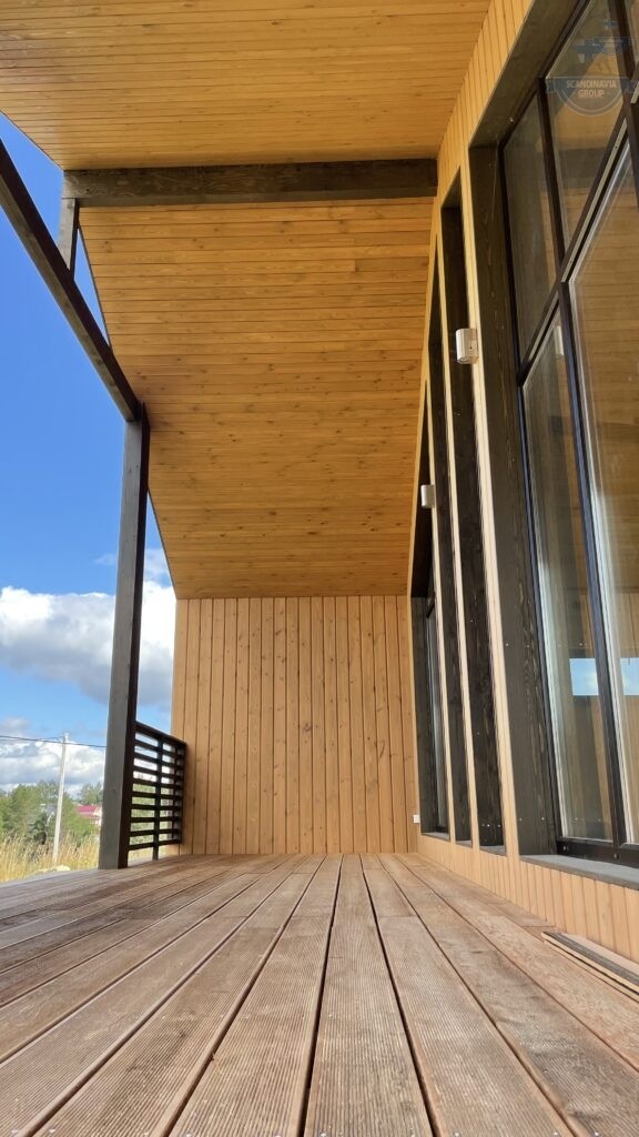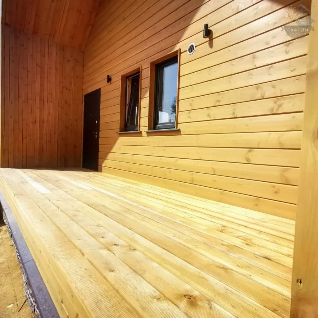 • Внутренняя отделка — имитатор бруса, евровагорнка (сорт АВ) ВДСПШ QuickDeck Pro, м/к двери, террасная доска