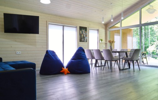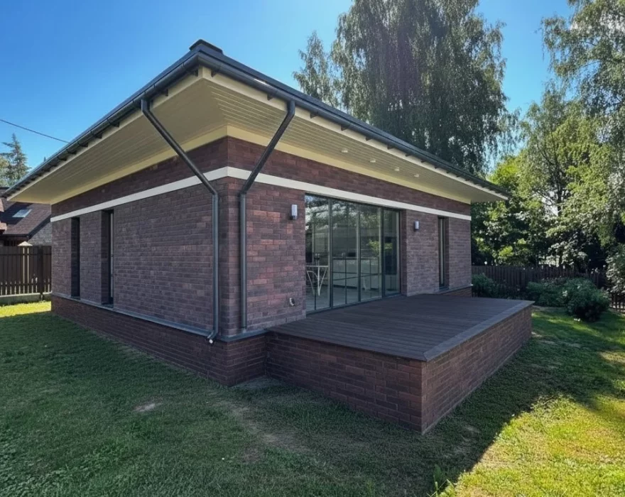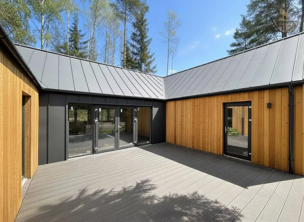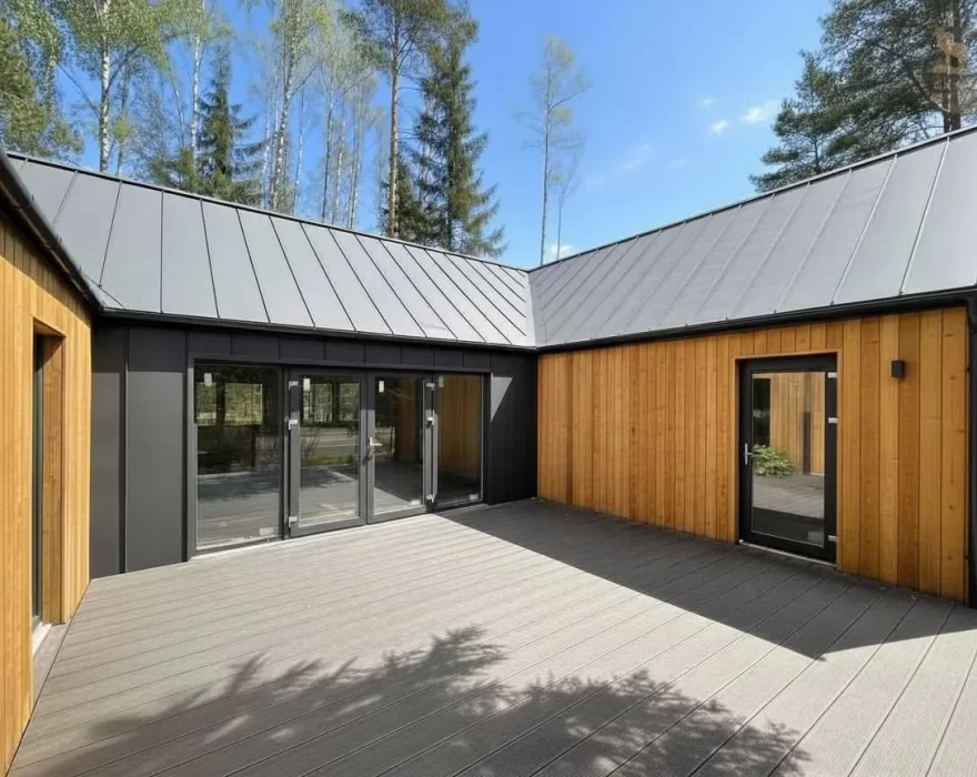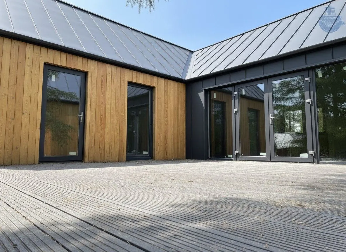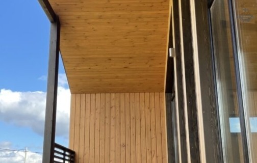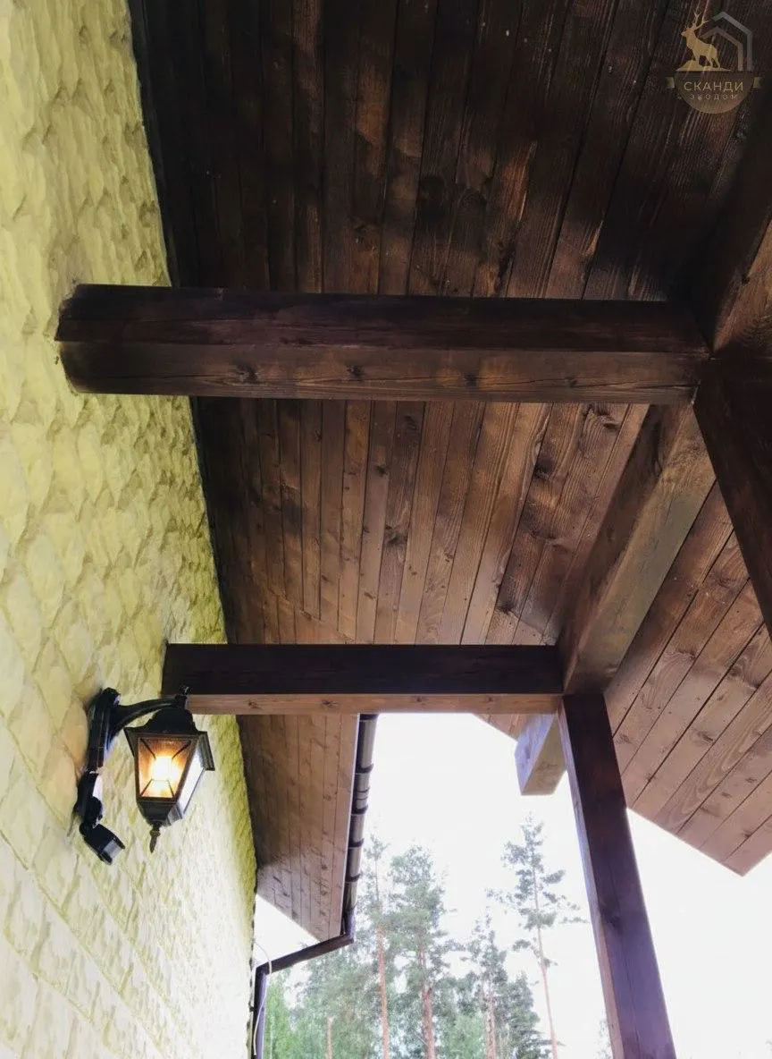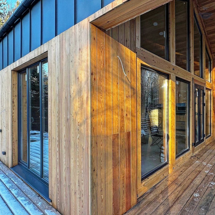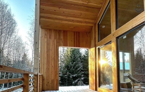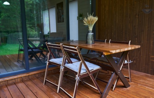 • Внутренняя отделка — имитатор бруса, евровагорнка (сорт АВ) ВДСПШ QuickDeck Pro, м/к двери, террасная доска