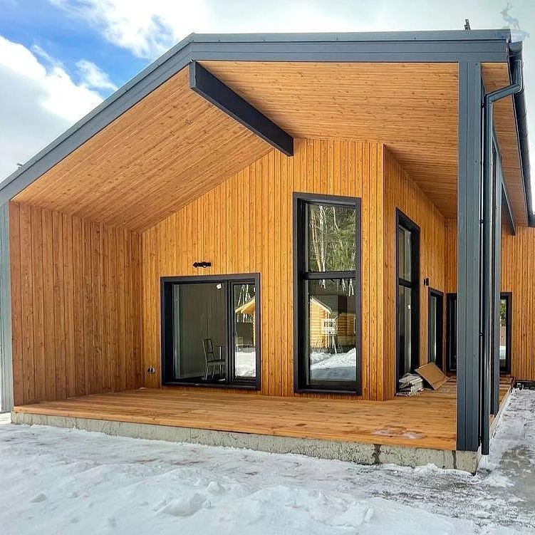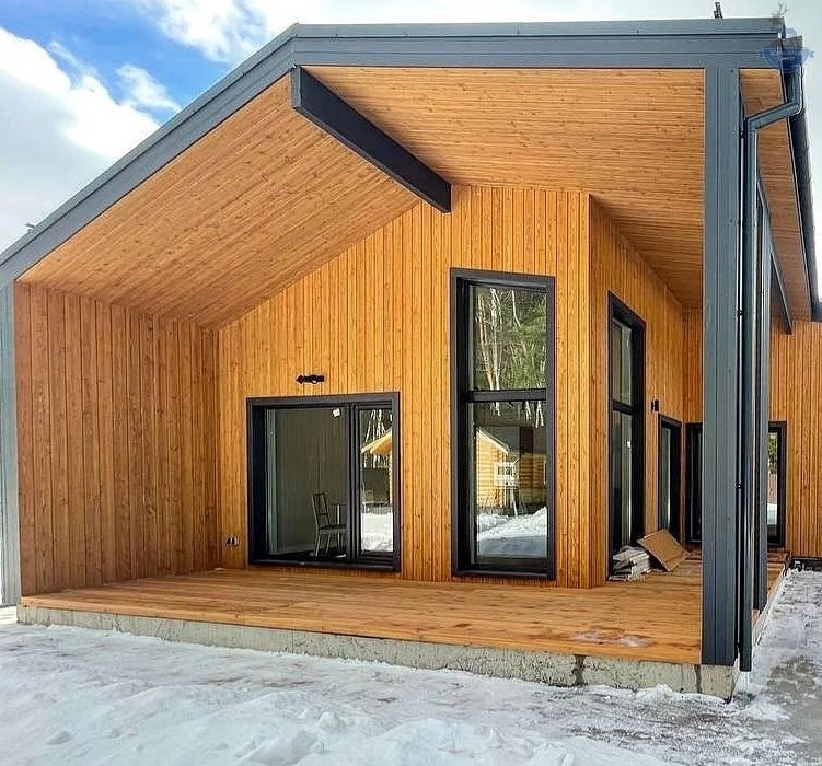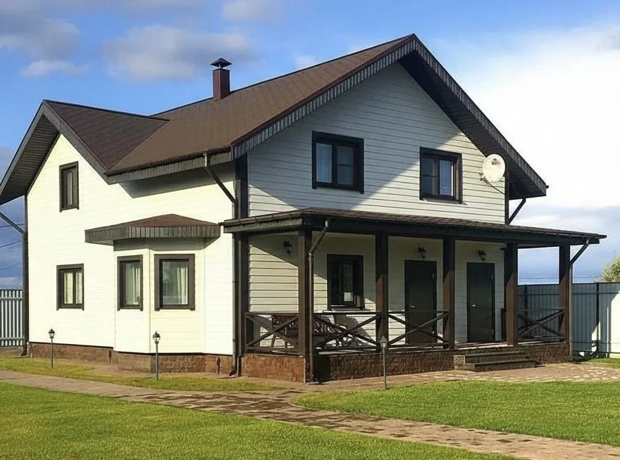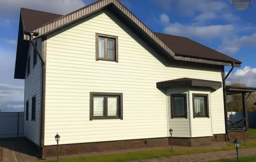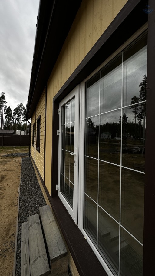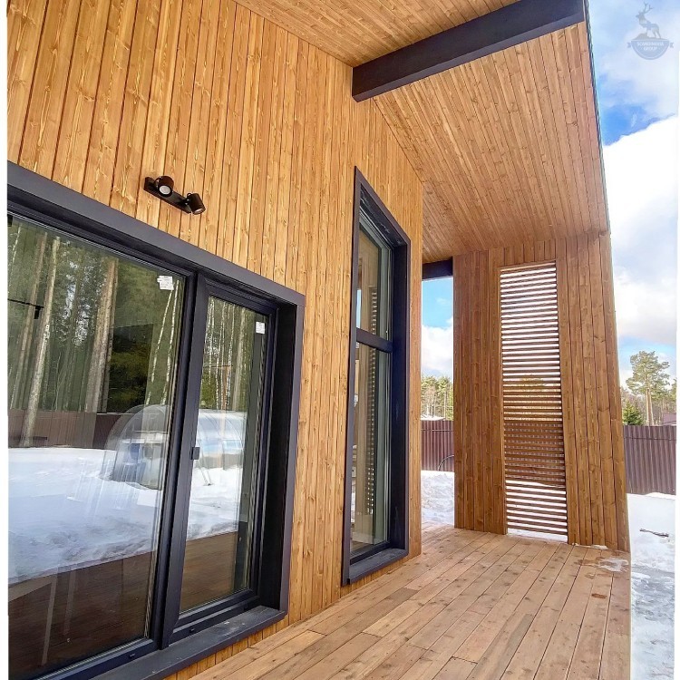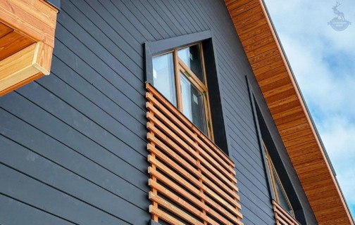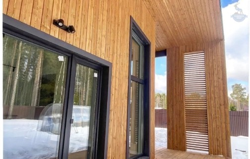 Шаг №4 – внешняя отделка дома: монтаж теплоизоляции (плиты из древесного полотна), фасадных панелей, сайдинга или имитатора бруса. Устанавливаем двери и окна, террасы, балконы и ограждения.