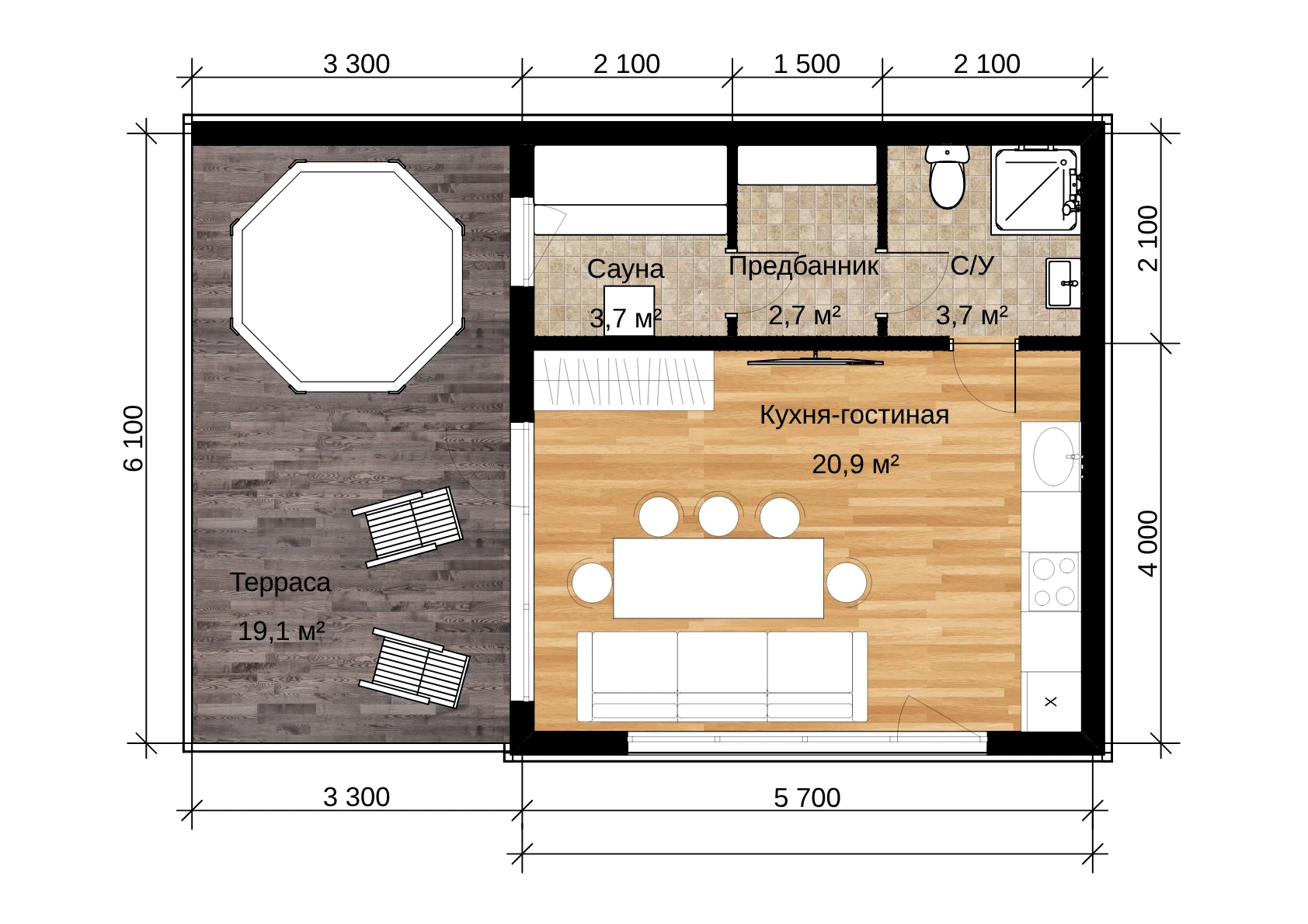 Планировка включает сауну площадью 3,7 кв.м, небольшой санузел 3,3 кв.м и холл 14,4 кв. м. Помещения удобно соединены между собой. Благодаря наличию комнаты, баня сможет стать временным жильем, пока строится дом или местом для размещения гостей.