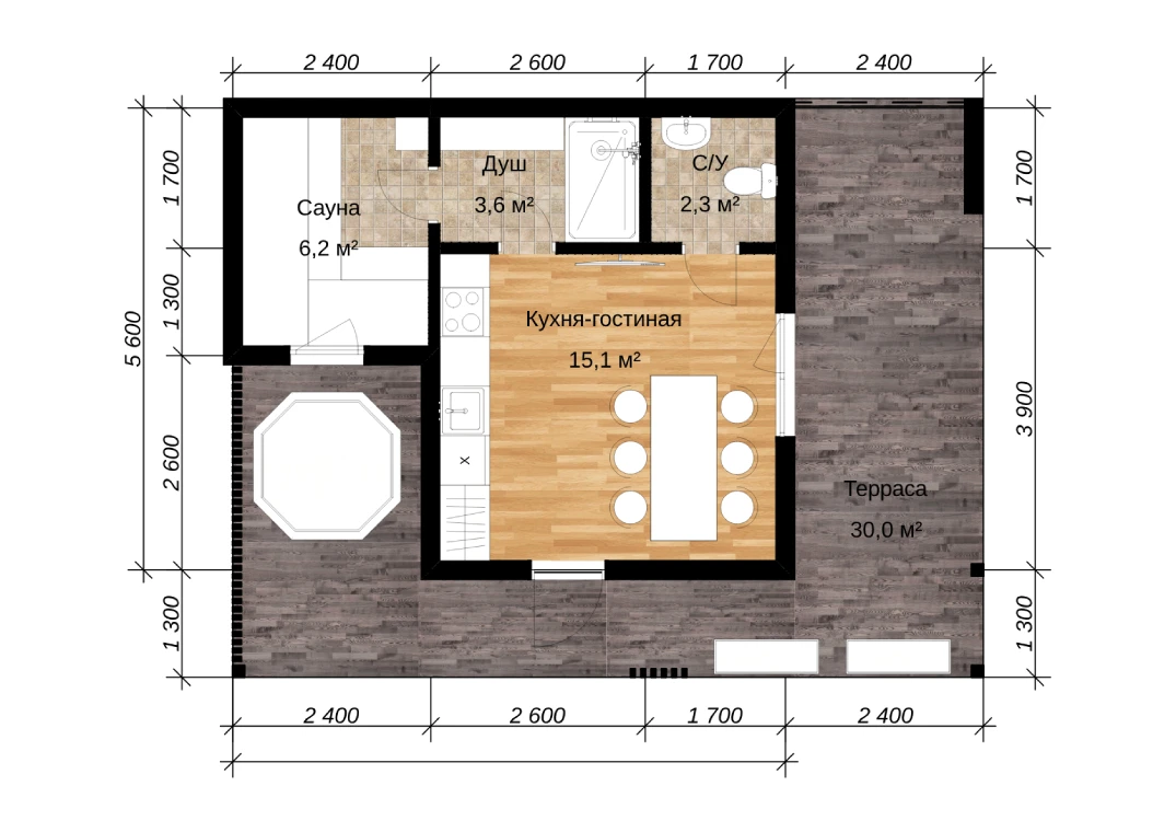Одно из главных преимуществ проекта — наличие небольшого бассейна на террасе. Здесь можно освежиться после банных процедур.