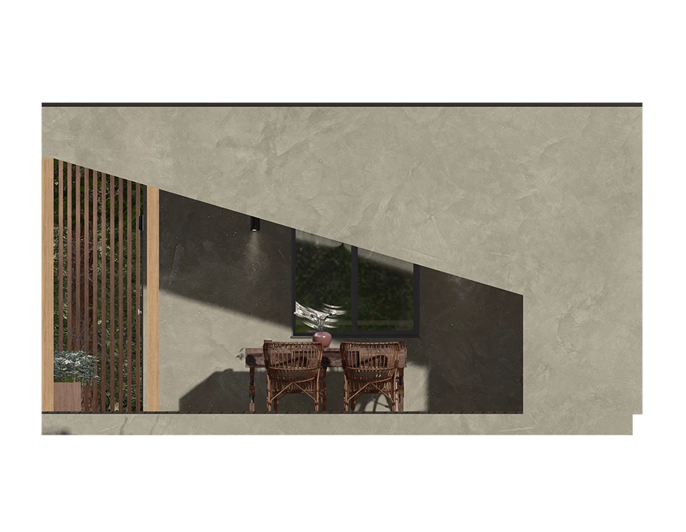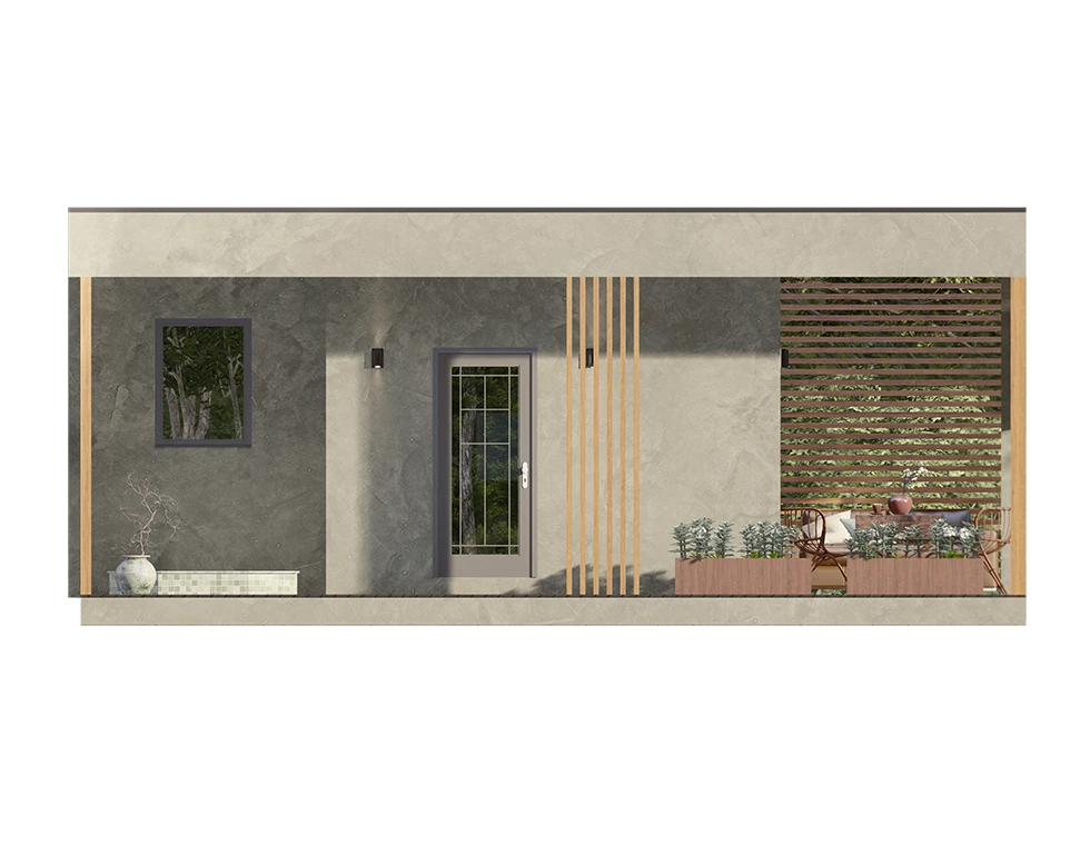 Планировка включает пространство для отдыха в помещении и на свежем воздухе — здание оснащено просторной крытой верандой. Здесь достаточно места для размещения мебели — большого стола, кресел. Вы сможете устраивать трапезы, пить любимые напитки, наслаждаясь видом природы.