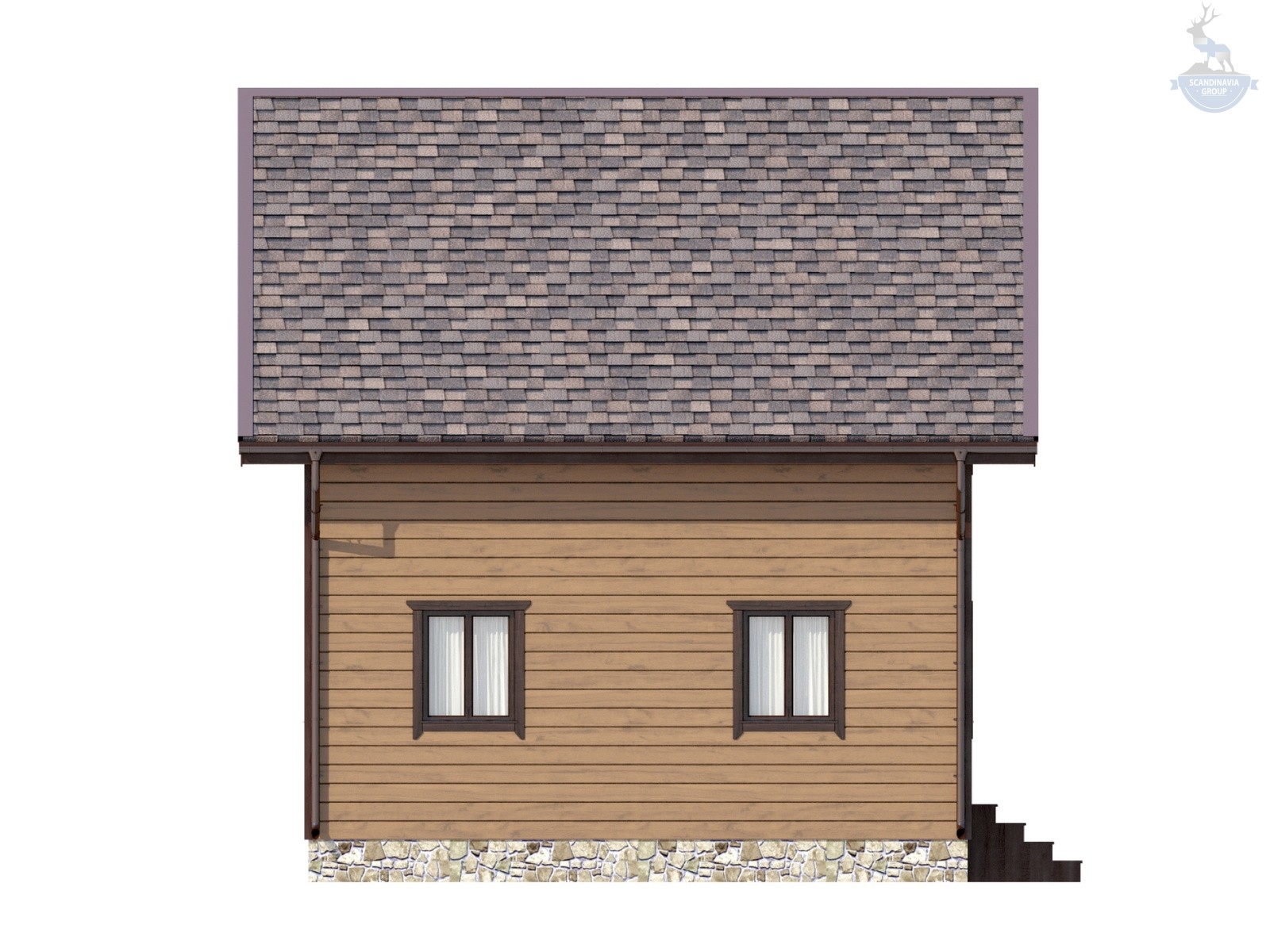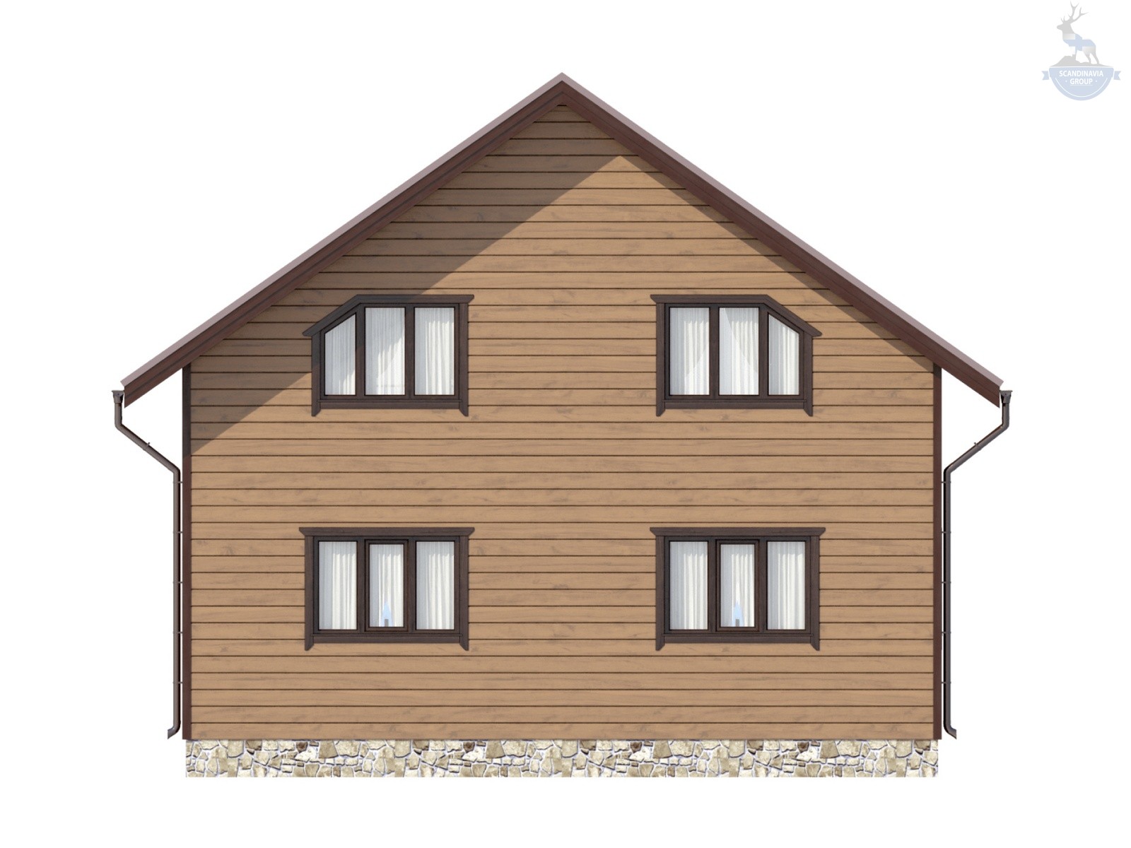 Имитатор бруса «Карельский профиль», окрашенный в производственных условиях кликфальц/штукатурка по проекту + ветро теплоизоляционными плиты БЕЛТЕРМО TOP 25мм., шип-паз, устройство водоотливной металлической планки по периметру дома, оконные отливы, наличники окон и дверей. Гидроизоляция террас, балконов.