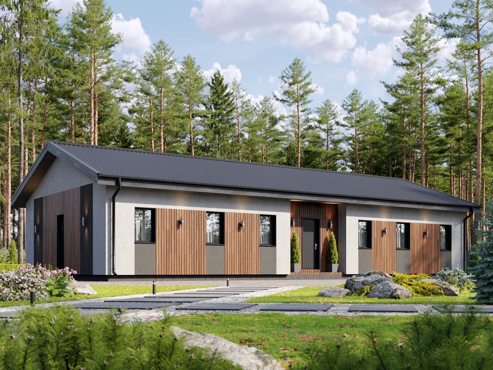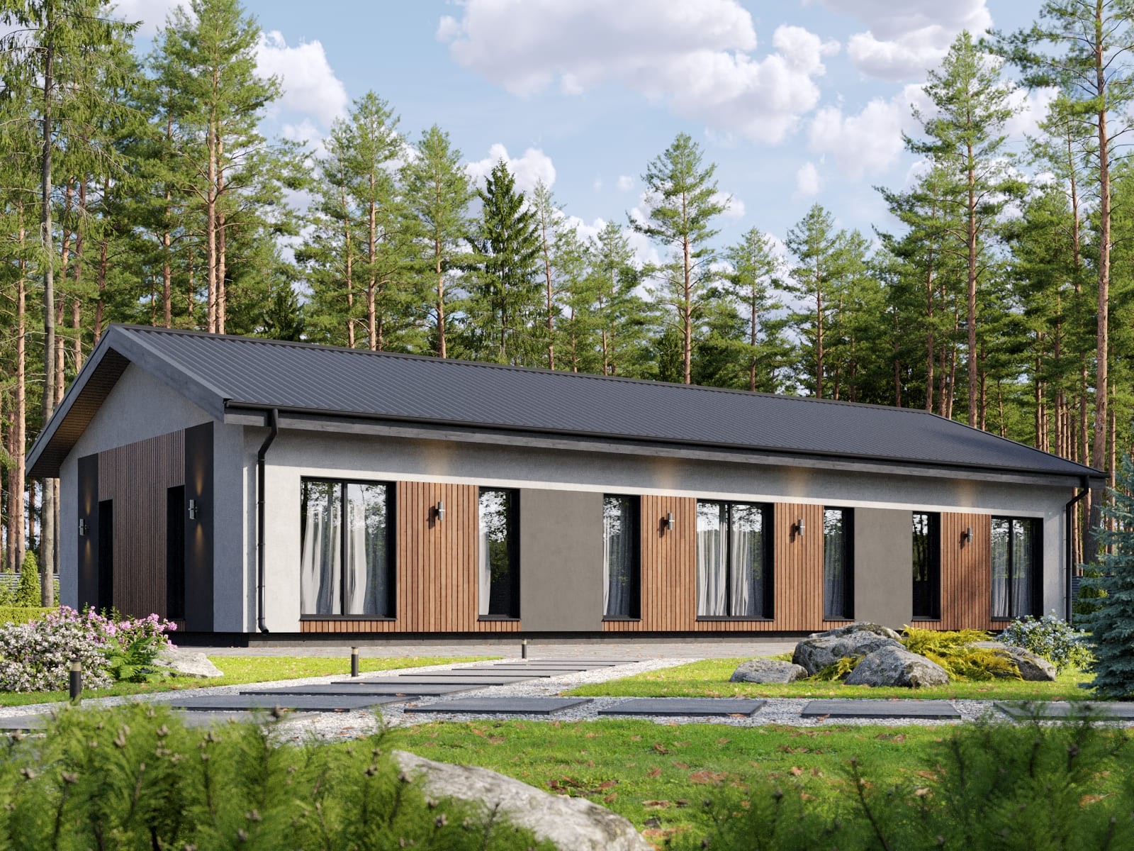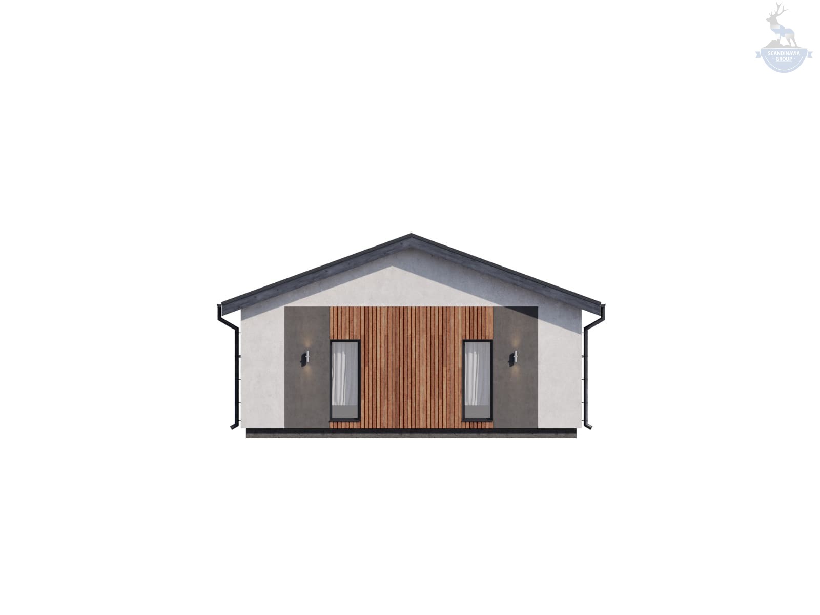 Лаконичный экстерьер коттеджа понравится любителям минимализма и современной архитектуры. Здание спроектировано из экологичных материалов, которые прекрасно держат тепло. За счет этого в помещении круглый год поддерживается комфортная температура, воздух хорошо циркулирует.