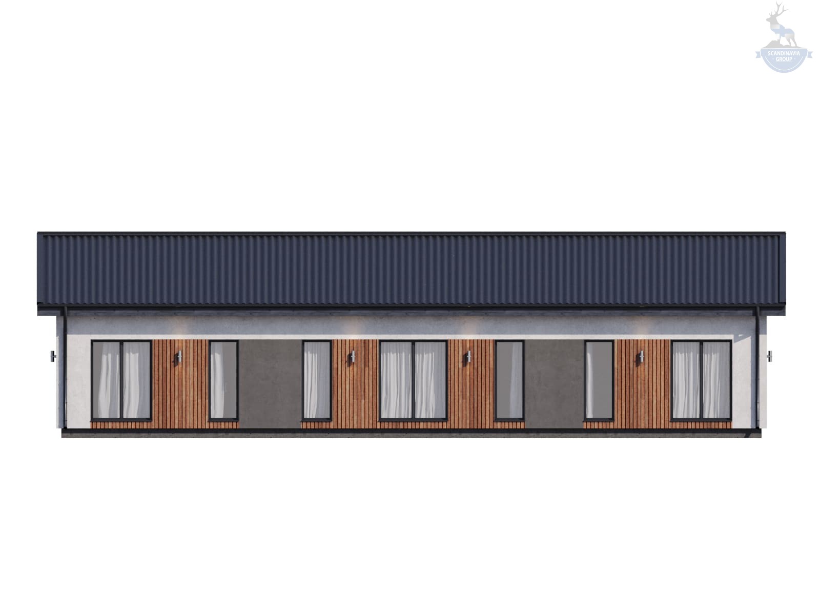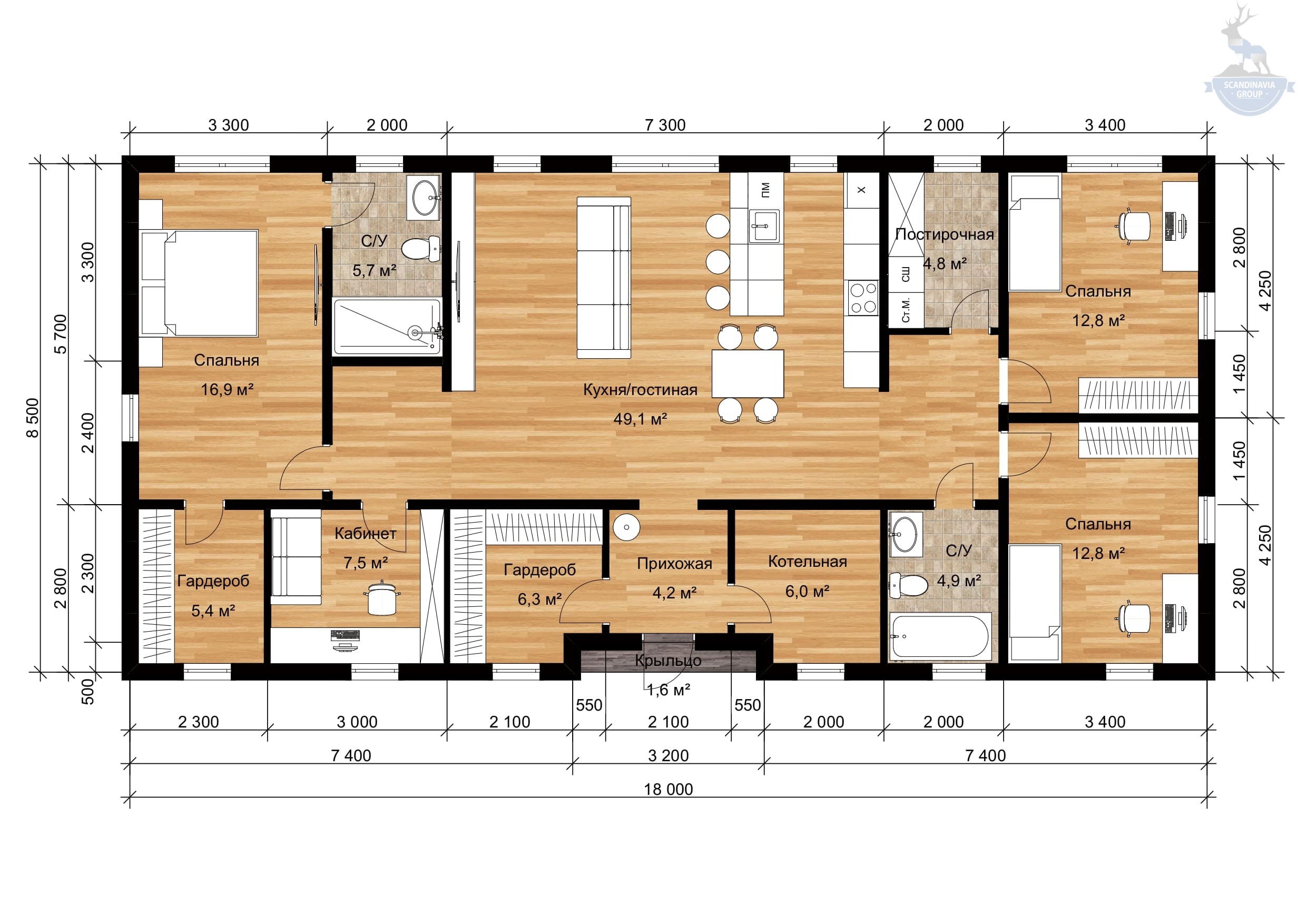 Одноэтажный дом по проекту КД-1210 имеет вытянутую форму, поэтому идеально подойдет для прямоугольного участка. Его размеры составляют 8,5*18 м. Общая площадь здания — 153 квадратных метра. Внутри с комфортом разместится семья из 3-5 человек. Здесь предусмотрено все, как для комфортного сезонного отдыха за городом, так и для постоянного проживания.