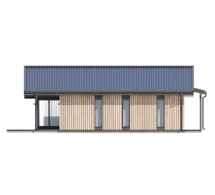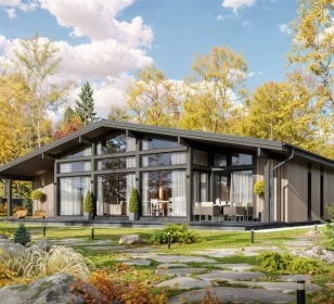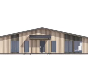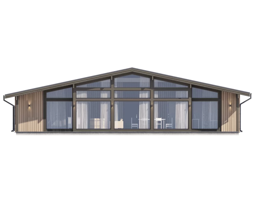 Дом по проекту КД-1310 – это современный коттедж площадью 180 квадратных метра в стиле фахверк. Отличный выбор для узкого и длинного участка, поскольку коттедж имеет прямоугольную форму: размеры строения по периметру составляют 16,4X11 м. Проект сочетает комфорт, функциональность и приятный внешний вид. Одно из его главных преимуществ – панорамное остекление, благодаря которому в помещения проникает много света. Круглосуточно и в любую погоду владельцы смогут наслаждаться видом на живописную природу.