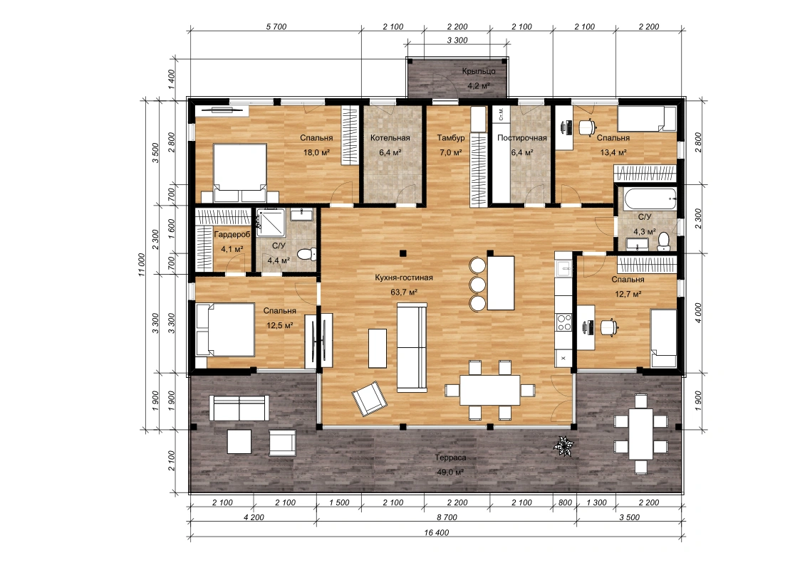 Внутренняя планировка дома предлагает все удобства для комфортной жизни семьи из 4-6 человек. Из просторной гостиной правильной формы открывается вход в четыре уютные спальни. Одна из них оснащена обособленным санузлом и гардеробной. Также в планировку заложен один общий санузел, постирочная, котельная.