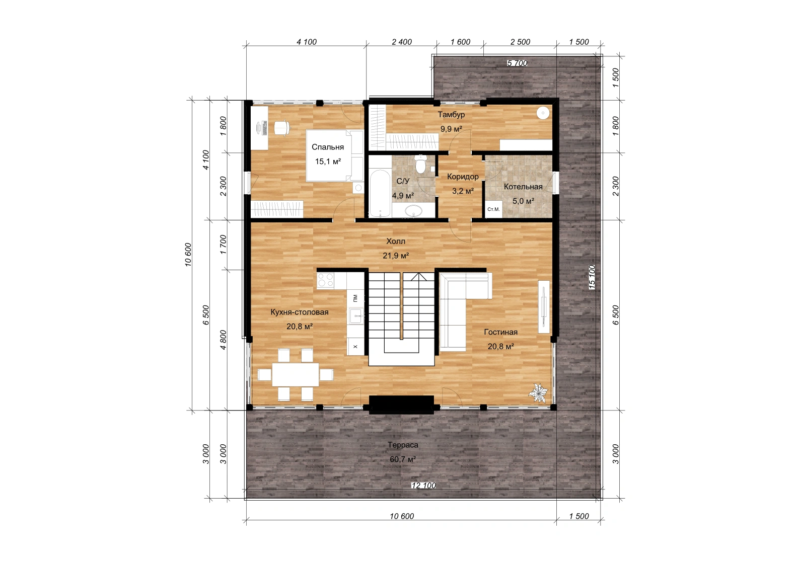 Коттедж имеет два выхода на улицу. Оба они проходят через просторную террасу, которая огибает дом с трех сторон. Большая площадь позволит уютно обустроить пространство на свежем воздухе – разместить здесь мебель, технику для отдыха.