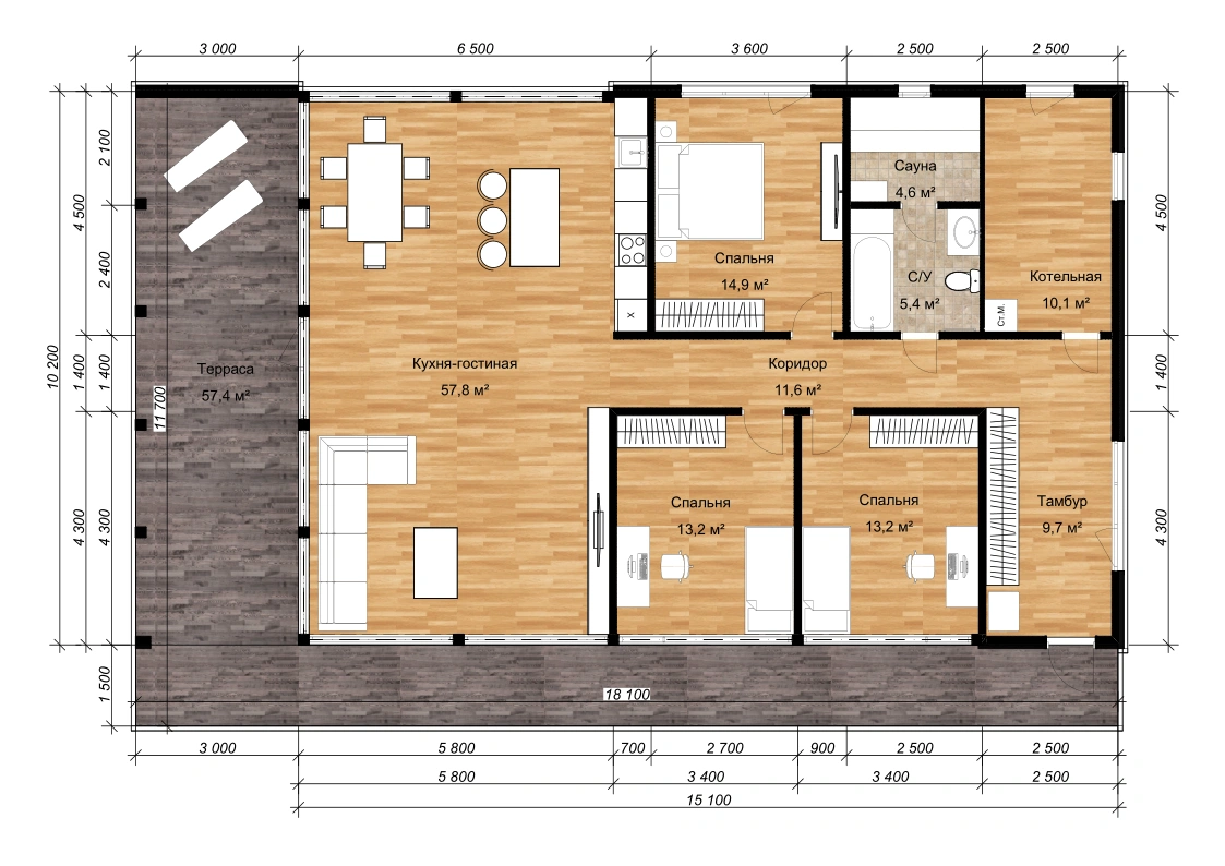 Внутренняя планировка состоит из кухни-гостиной с место под столовую зону, трех спален, санузла, совмещенного с сауной, котельной и тамбура-прихожей. Расположение и форма помещений внутри дома продуманы таким образом, что будущий домовладелец может удобно переделать их под нужды семьи: в одной из спален оборудовать кабинет или комнату для занятий спортом, разделить помещение кухни-гостиной на 2 и даже 3 зоны барными стойками и легкими перегородками, вместо прихожей оборудовать гардеробную или кладовую.