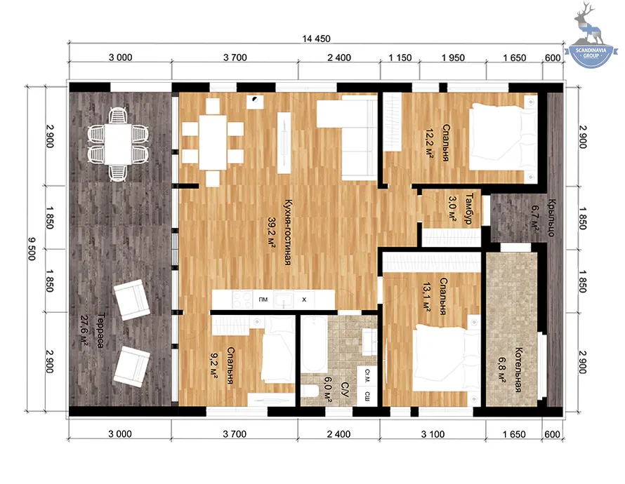 Проект рассчитан на комфортное проживание семьи из 3–5 человек. В доме предусмотрены три спальни площадью от 9,2 до 12,2 м², просторная кухня-гостиная площадью 39,2 м², ванная комната и удобные вспомогательные помещения – котельная и тамбур.