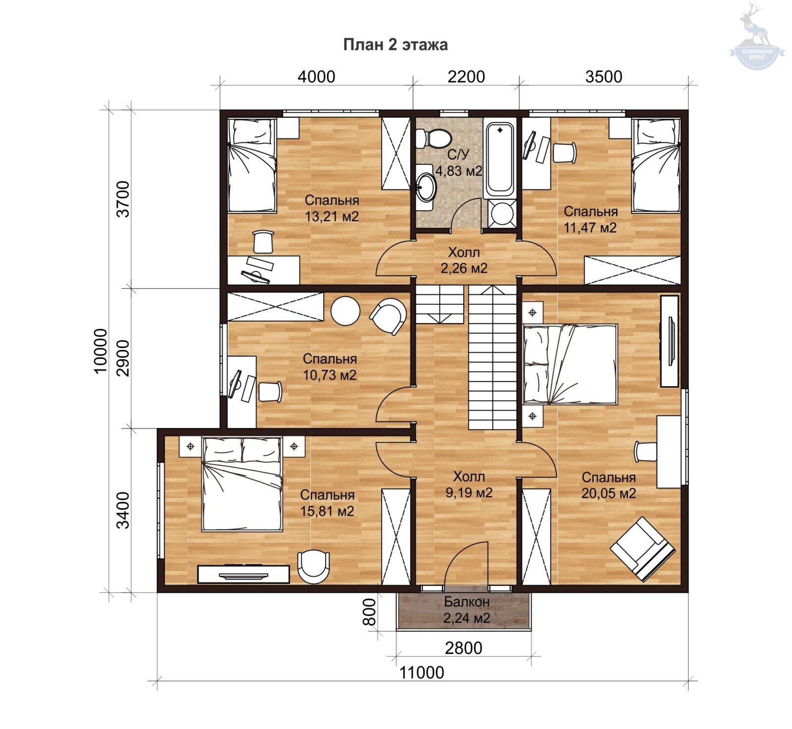 На втором этаже расположено пять спален, две из которых взрослые и три – детские. Двери всех спален выходят в широкий холл во всю длину этажа, который заканчивается выходом на балкон. На противоположном конце холла находится общий санузел.