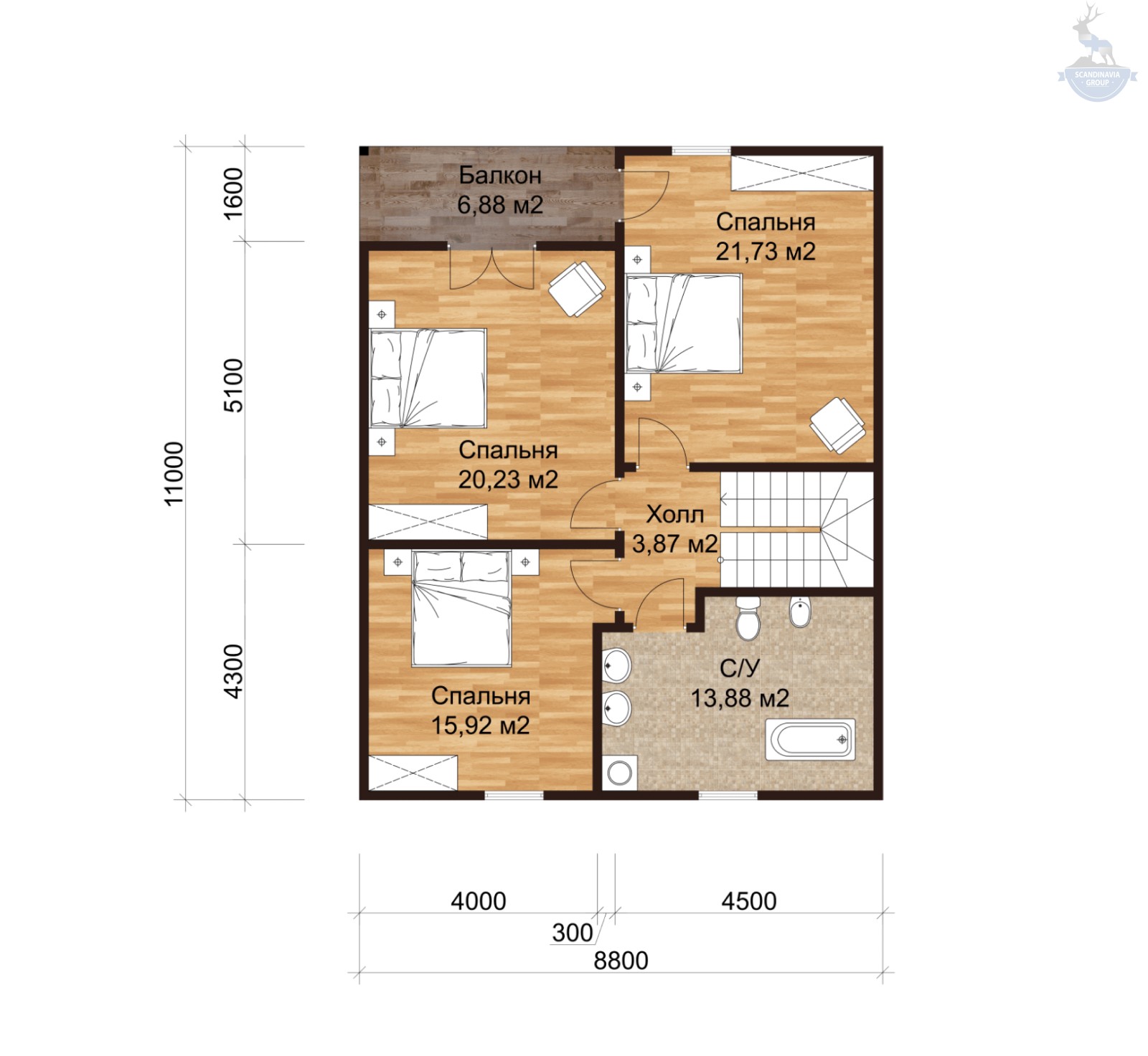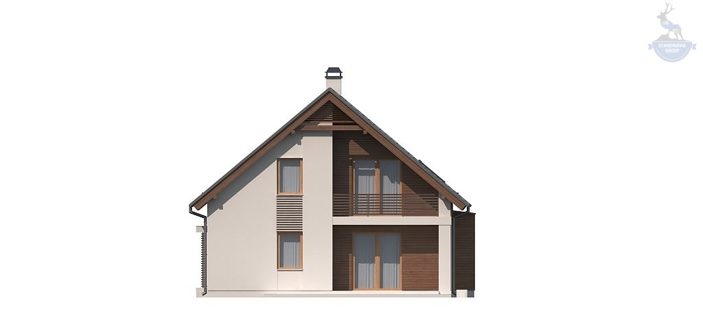 На втором этаже кроме спален размещен просторный санузел. Для двух комнат спроектирован выход на общий балкон.