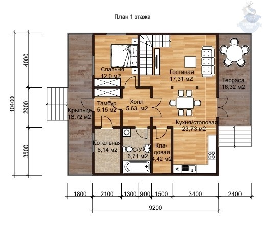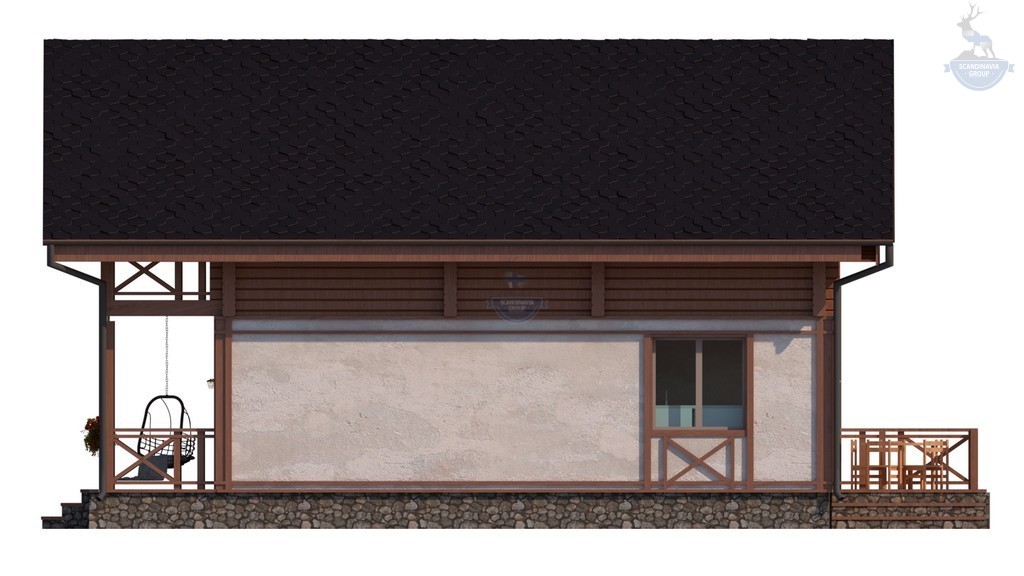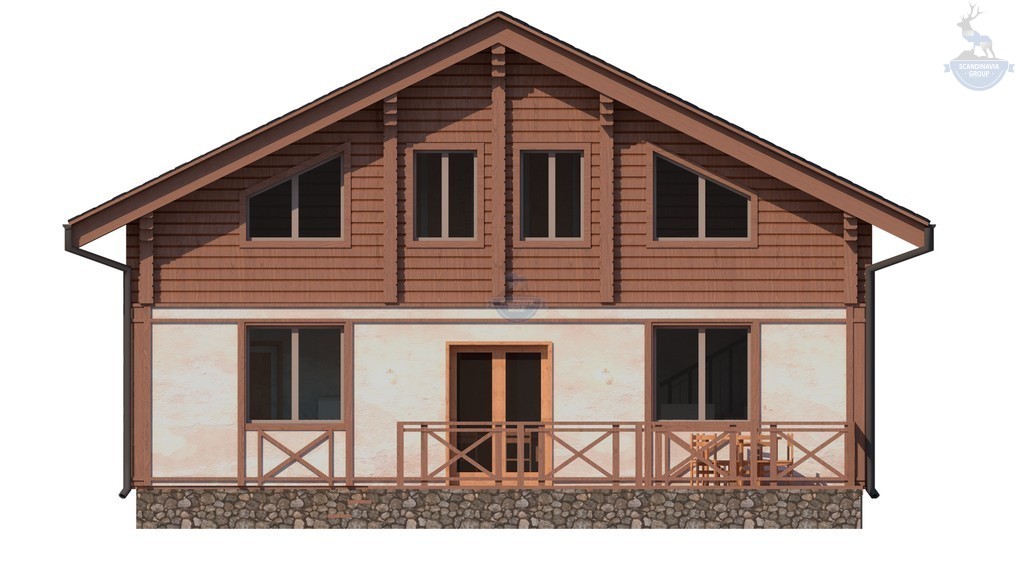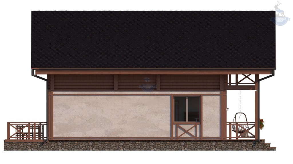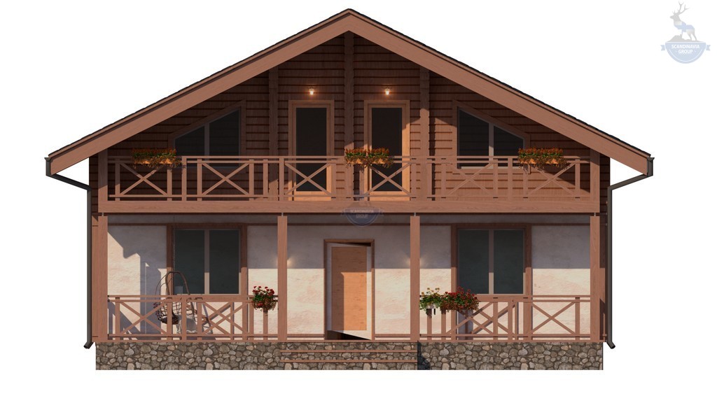 На первом этаже расположена спальня 12 м², которую можно использовать как гостевую или для людей с ограниченными возможностями, пожилых. Наличие тамбура на входе в коттедж способствует сохранению тепла и энергосбережению. На неотапливаемой террасе в задней части дома можно разместить зону отдыха или летнюю столовую. На втором этаже имеется большой балкон, который можно использовать для завтрака на свежем воздухе, чтения книг, медитации. Двускатная фахверковая крыша защищает крыльцо и террасу от осадков. В доме два входа, которые расположены на противоположных фасадах здания.