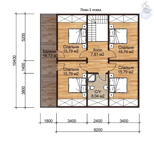 На первом этаже расположена гостиная-студия с кухней. На каждом этаже имеется санузел. На втором уровне четыре мансардные спальни с одинаковой по площадью — 15,79 м². Комнаты расположены симметрично. Из двух спален есть выход на балкон, расположенный вдоль фасада второго этажа. Вход в спальни из общего холла, на который выходит лестница с первого этажа.
