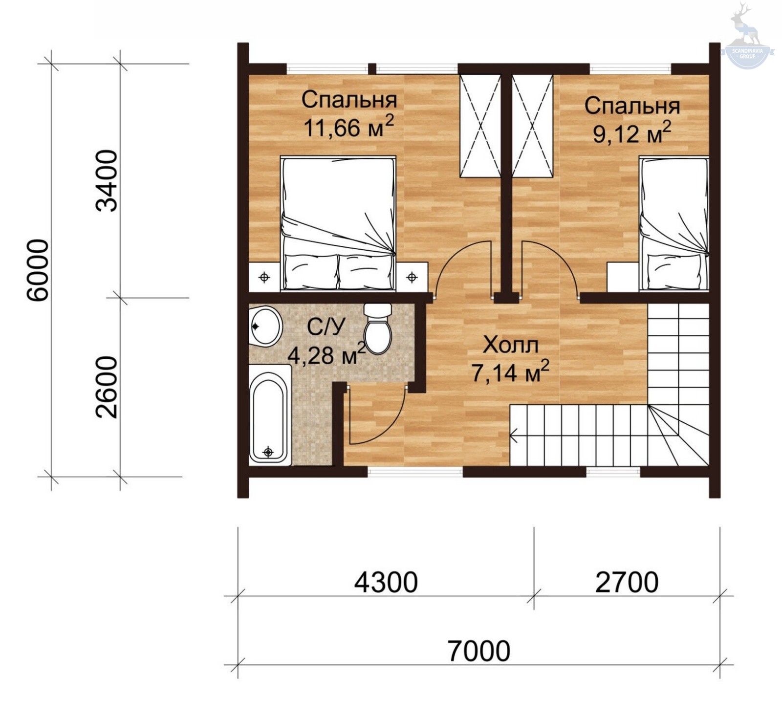 На втором уровне находятся две спальни. Также здесь — санузел и просторный холл, где удобно хранить вещи.