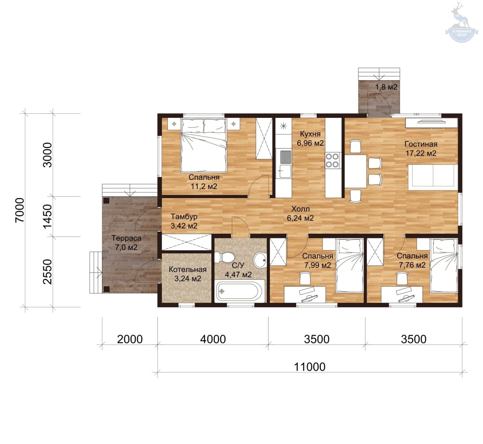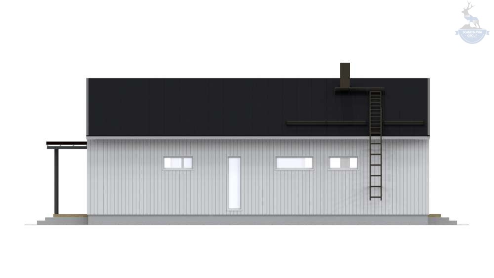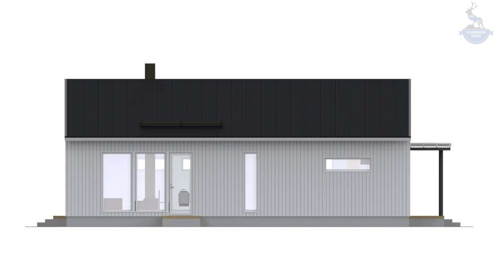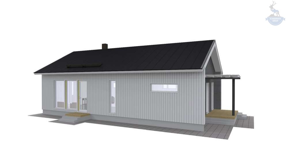 Одноэтажный каркасный дом с террасой КД-330 в скандинавском стиле имеет вытянутую форму строения, размеры 7х13 м и общую площадь 77 квадратных метров. Пространство жилья организовано таким образом, что здесь сможет разместиться семья из 3-5 человек.Особенно хорошо этот вариант подойдет для жизни с детьми. Небольшие спальни станут уютными детскими. Отсутствие лестниц обеспечит для малышей безопасность, а небольшое расстояние между комнатами позволит взрослым быстро дойти до детской в случае необходимости.