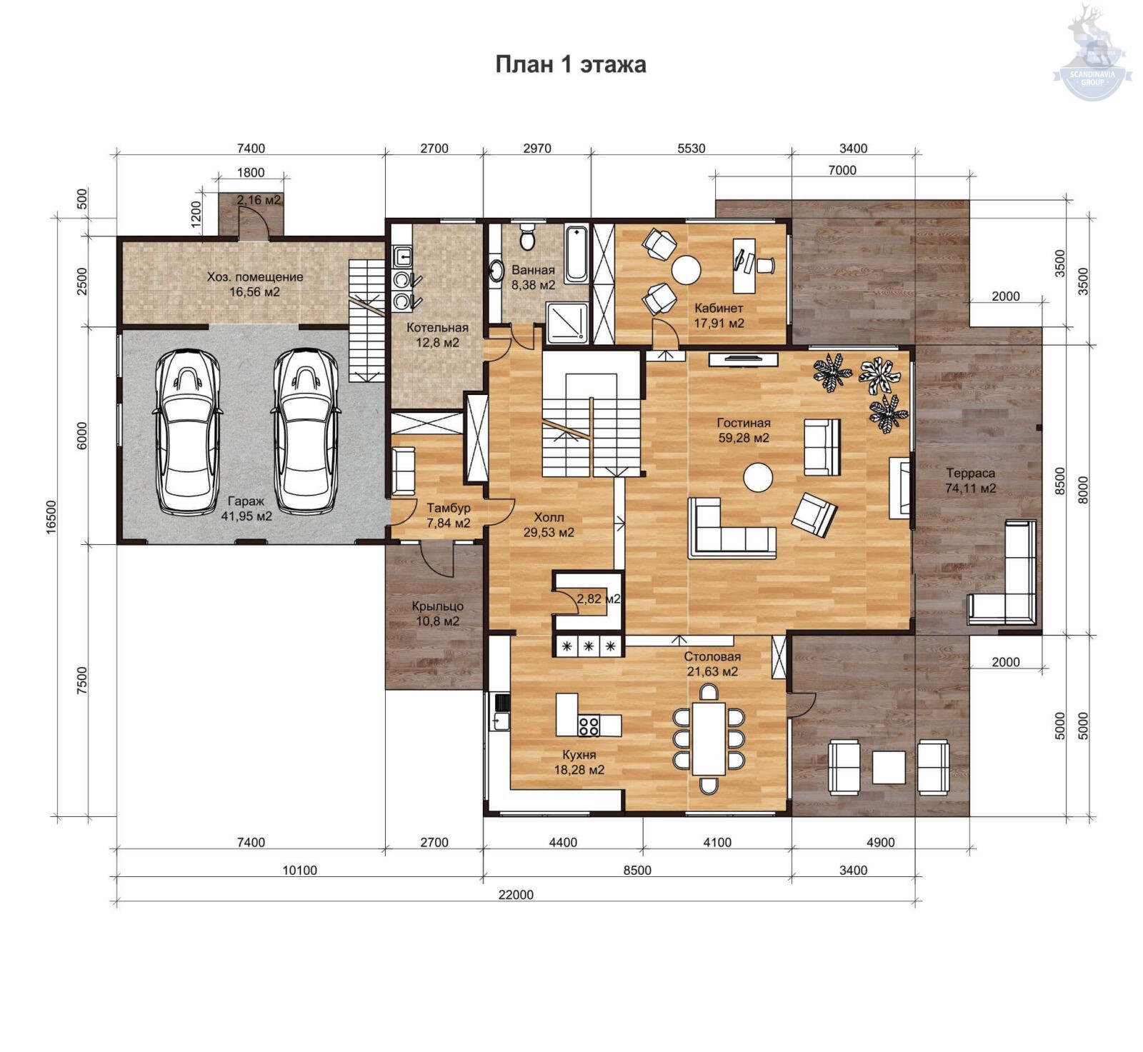 На первом этаже коттеджа находится просторная гостиная. К ней прилегает столовая, совмещенная с кухней. Из этих помещений открывается выход на большую террасу. Ее площадь в 75 квадратных метров позволит устроить удобную лаунж-зону для гостей во время праздников или организовать фуршет. Также первый этаж располагает кабинетом, который при желании можно использовать как спальню, а также просторной ванной комнатой.