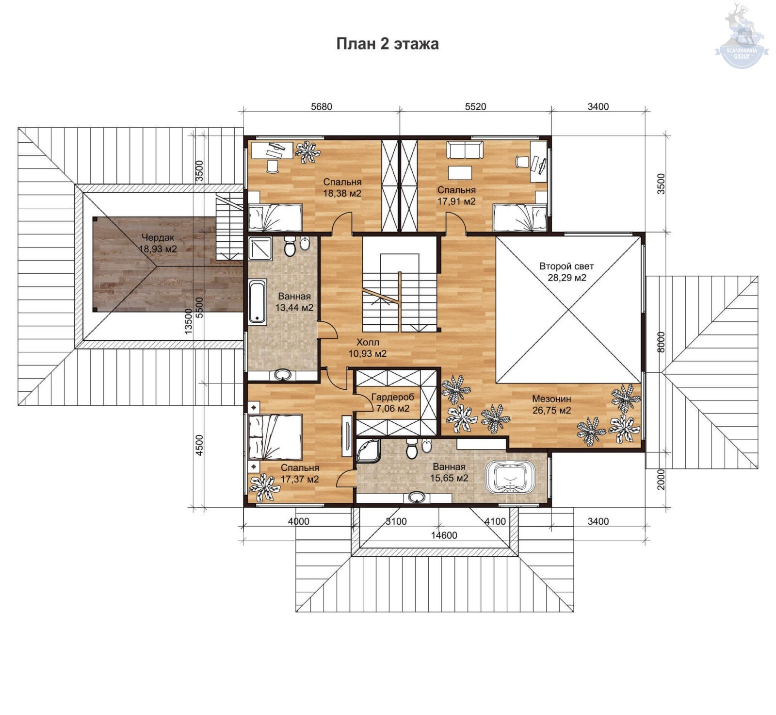 На втором этаже находится три спальни, гардеробная, два больших санузла, зона мезонина и выход на чердак. Площадь комнат позволит обустроить тут детские и гостевые спальни.