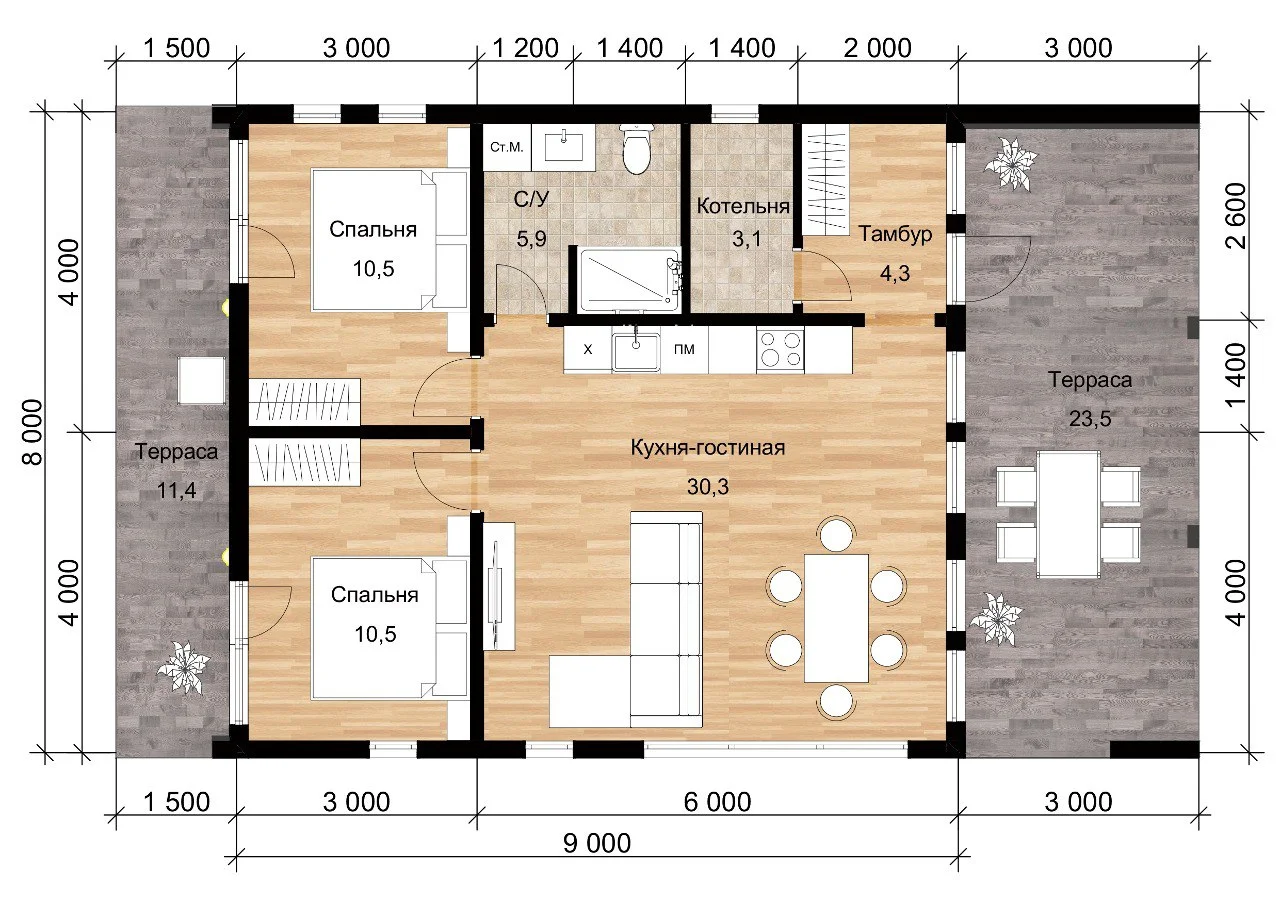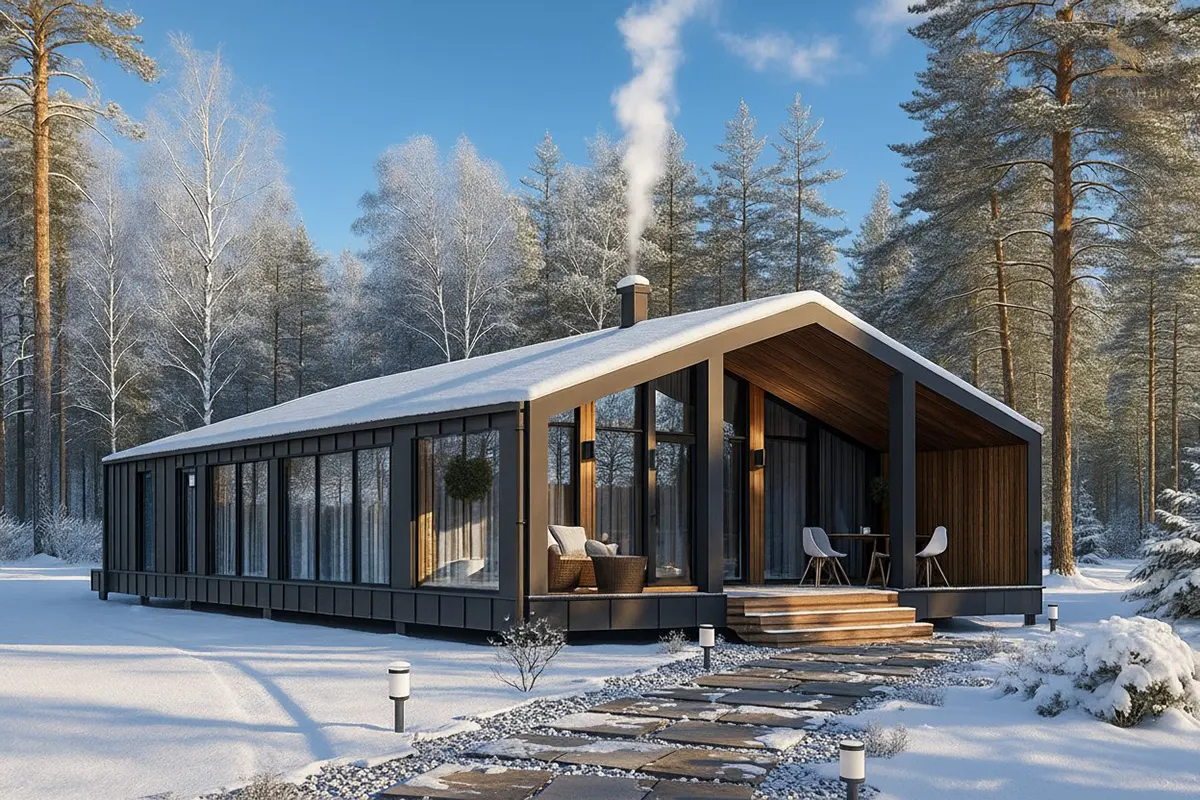 Одноэтажный каркасный дом с террасой и панорамными окнами, 100 м²