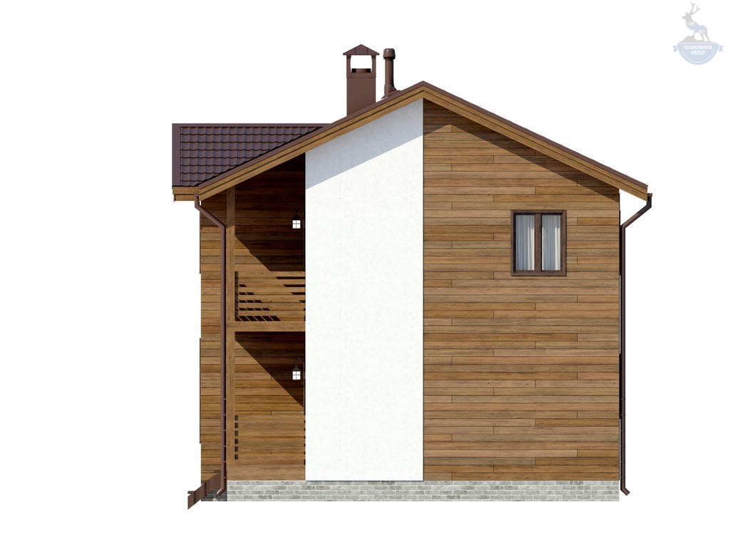 Ключевые особенности проекта КД-40: двускатная кровля, крытый балкон над террасой, большие окна в гостиной, обеспечивающие много дневного света.