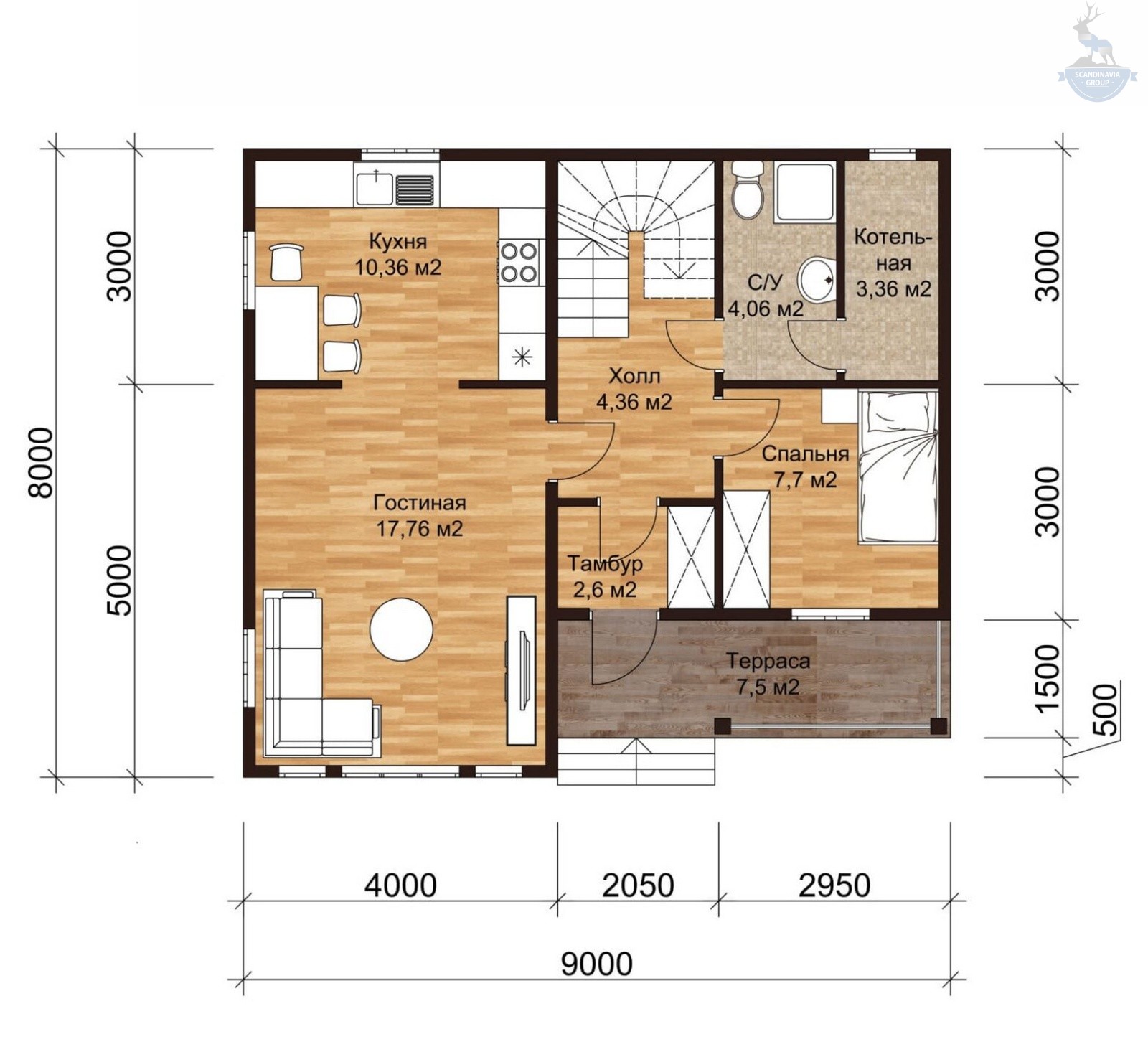 На первом этаже размещена гостиная, кухня, спальня, санузлы и технические комнаты. Входная дверь ведет на террасу и отделена от внутреннего пространства тамбуром, в котором разместится сезонный гардероб. На втором этаже — 3 спальные комнаты, каждую из которых можно использовать как кабинет, детскую или помещение для отдыха и игр. Винтовая межэтажная лестница станет особой изюминкой интерьера.