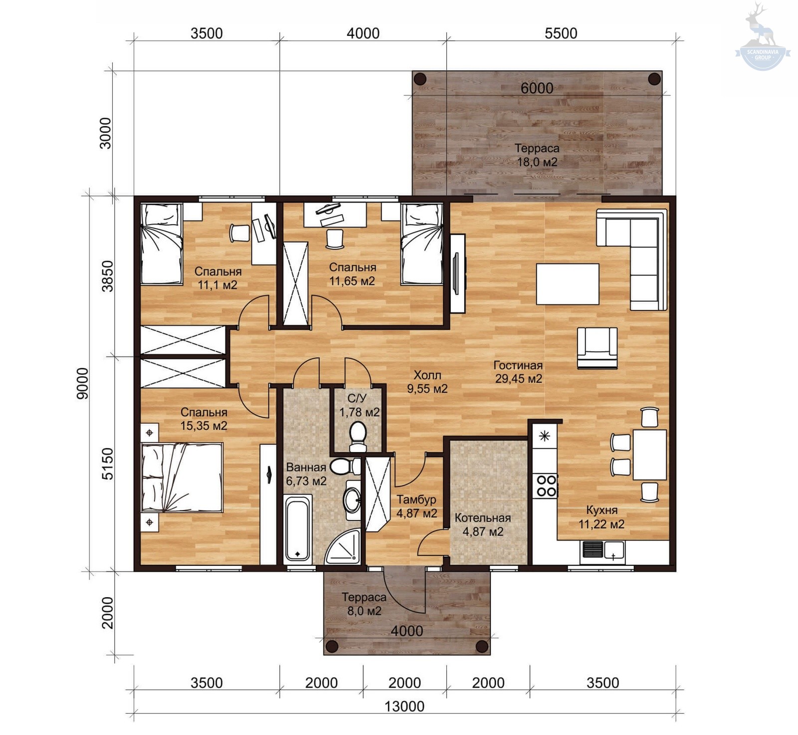 Планировка подразумевает наличие трех спален, раздельного санузла и общей кухни-гостиной. Здесь достаточно места, чтобы принимать гостей, играть с детьми и питомцами или же заниматься делами отдельно друг от друга, но находясь в одном помещении – площадь позволит разбить пространство на несколько функциональных зон.