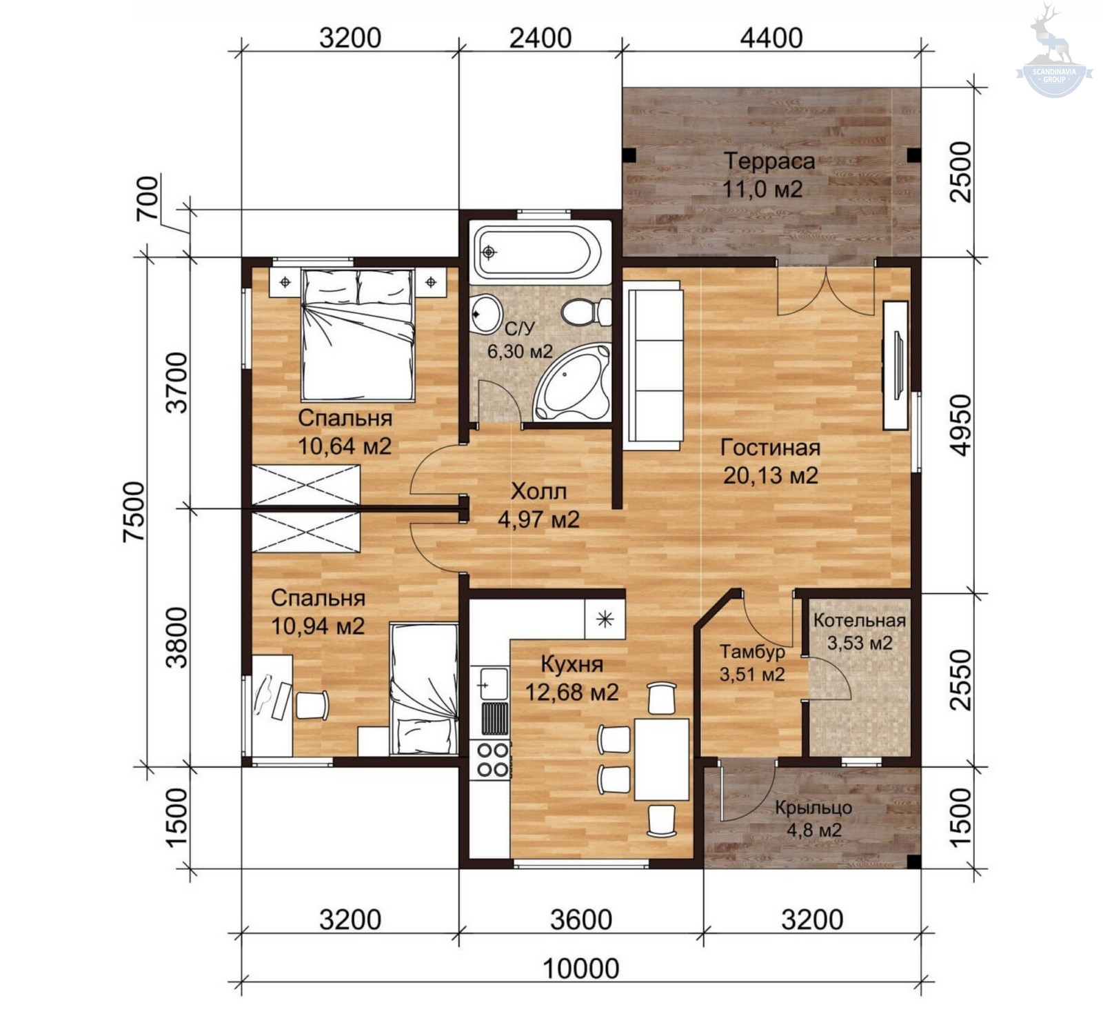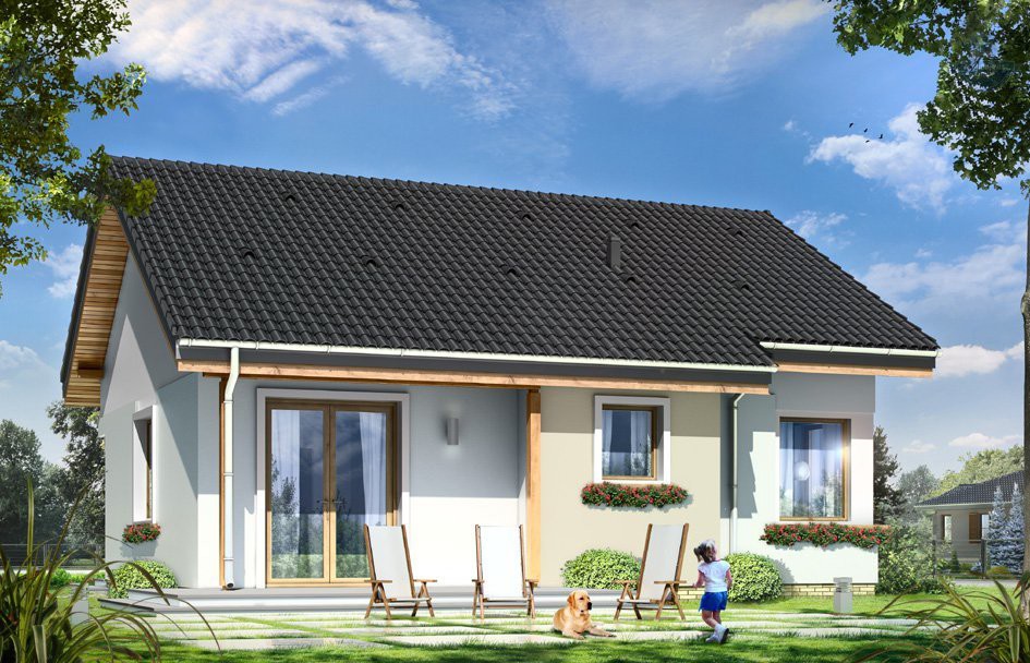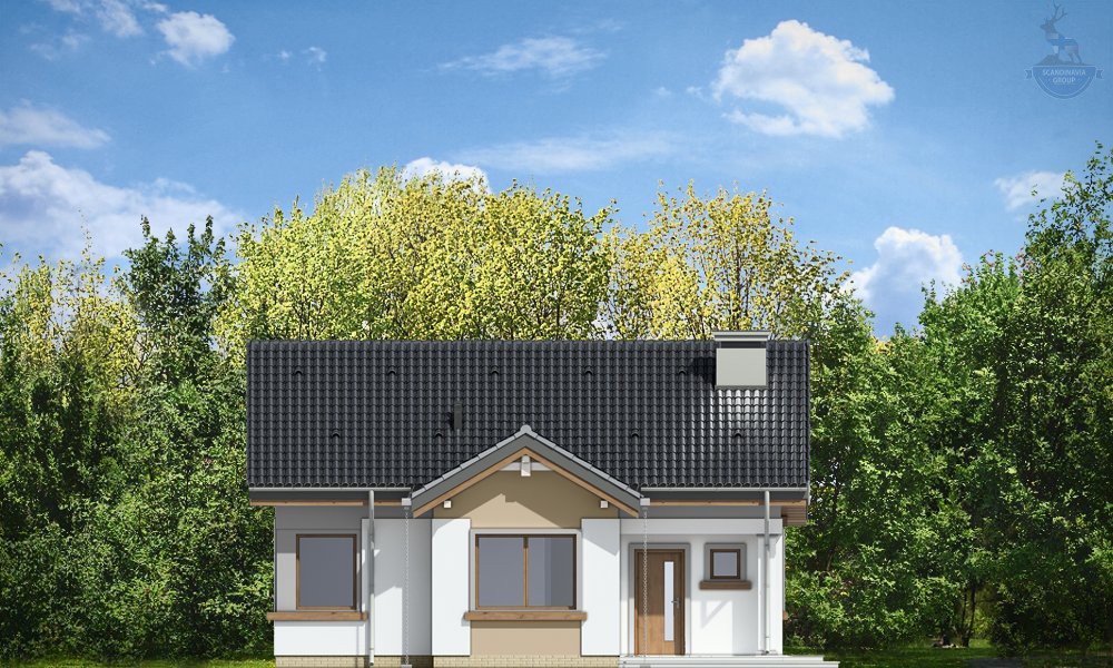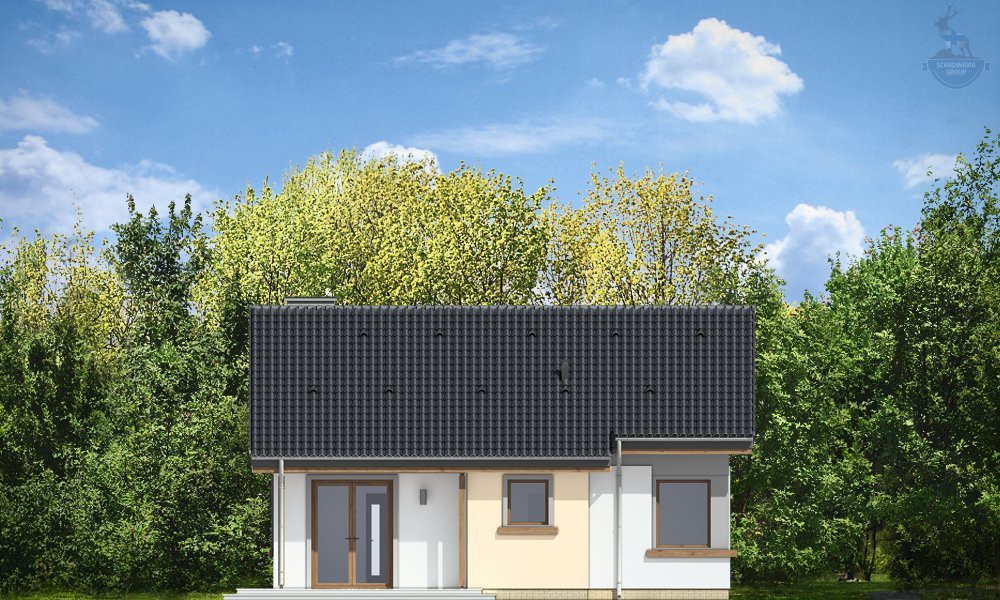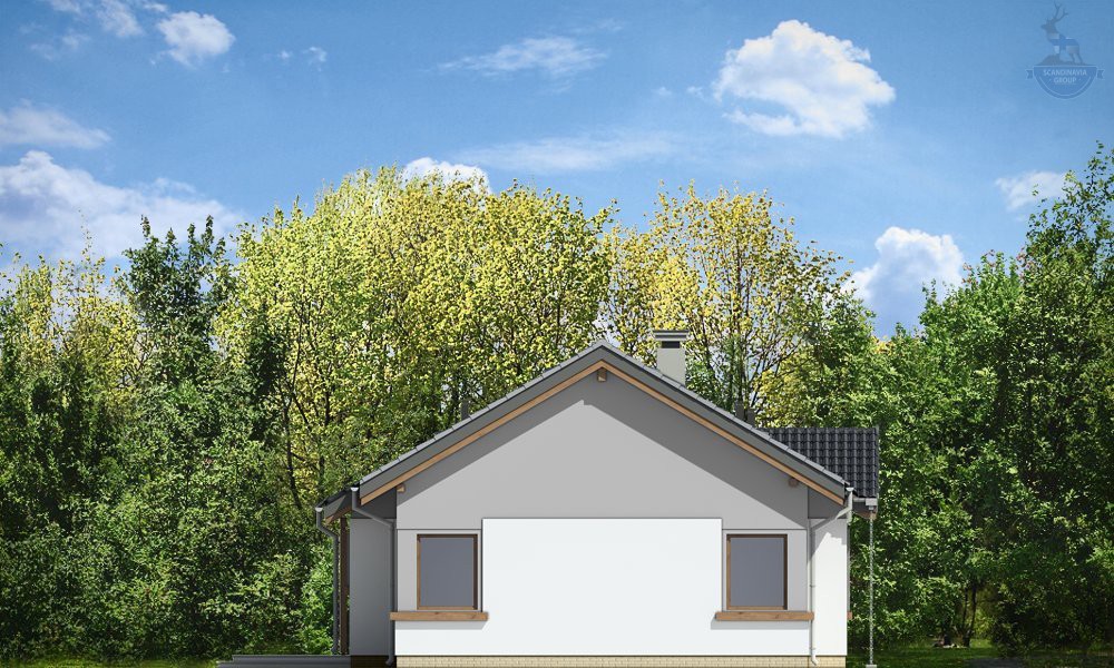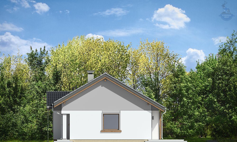 Эстерьер здания выдержан в классическом стиле: симметричная двускатная крыша, у входной двери крыльцо с декоративной колонной, с торца – терраса площадью 11 квадратных метров. С крыльца во внутренние помещения ведет тамбур, где можно обустроить место для хранения сезонных вещей и обуви. Направо из тамбура – вход в котельную. Если пройти прямо от входной двери, то здесь будущего владельца и его семью ждут просторная гостиная и функциональная кухня, далее – холл, который проведет в 2 уютные спальни или в санузел.