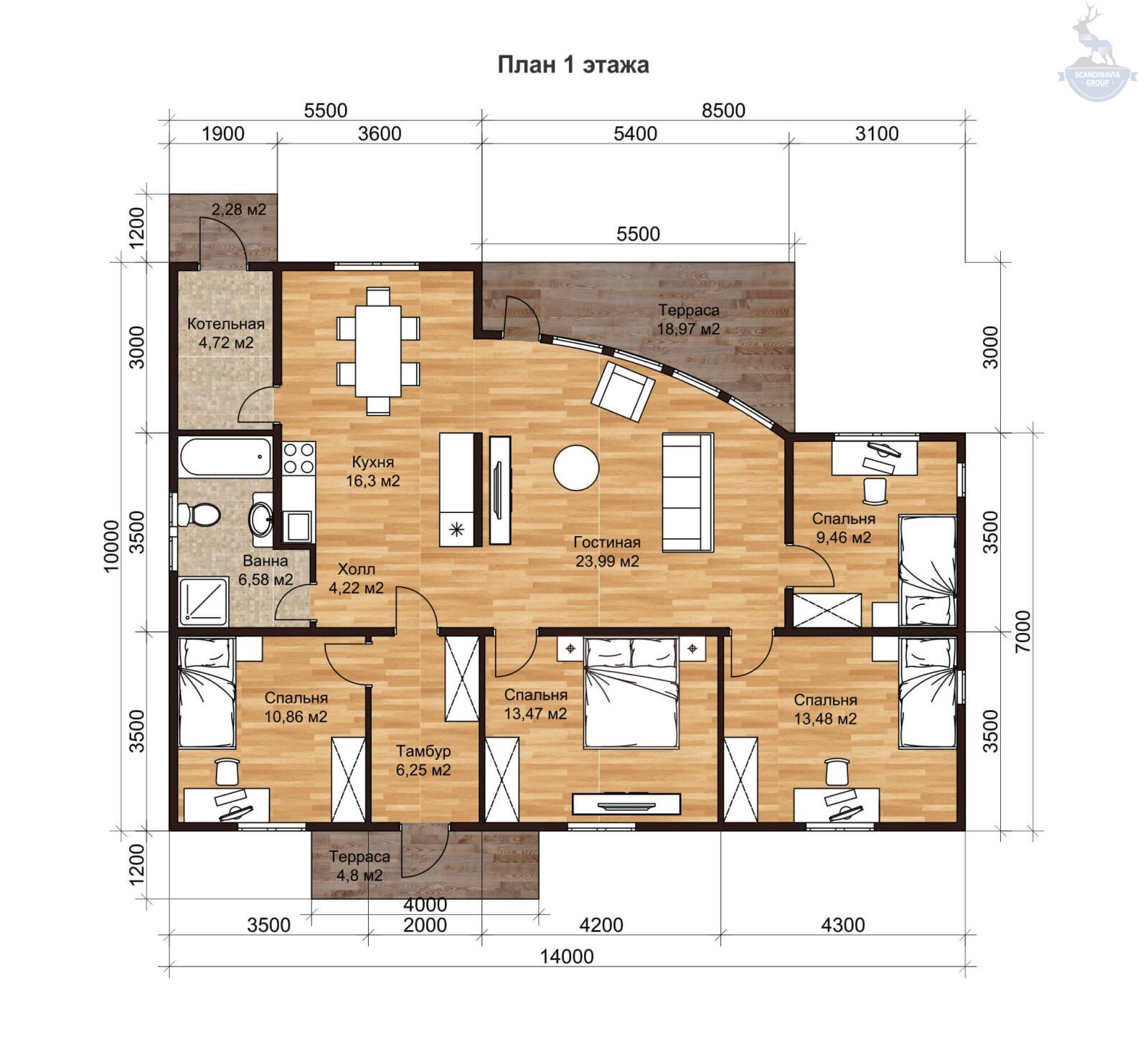 Каркасный дом КД-510 имеет просторную планировку, которая предоставляет множество возможностей для организации уютных и функциональных зон. Внутреннее пространство включает в себя кухню-гостиную, где вы можете проводить время со своими близкими и готовить вкусные блюда. Также есть 4 спальни, где каждый член семьи будет наслаждаться покоем и уединением. Кроме того, в коттедж есть совмещенный санузел с ванной и душевой кабиной и отдельное помещение для котельной, чтобы обеспечить жильцов теплом и комфортом в любое время года.
