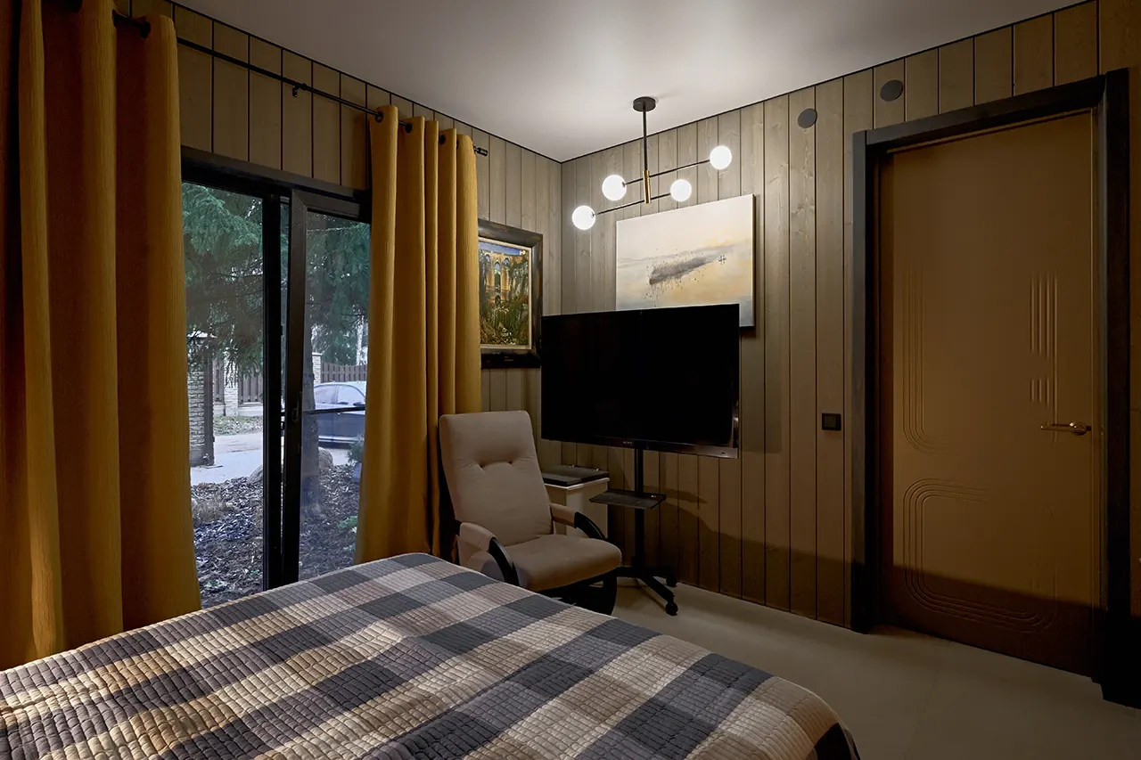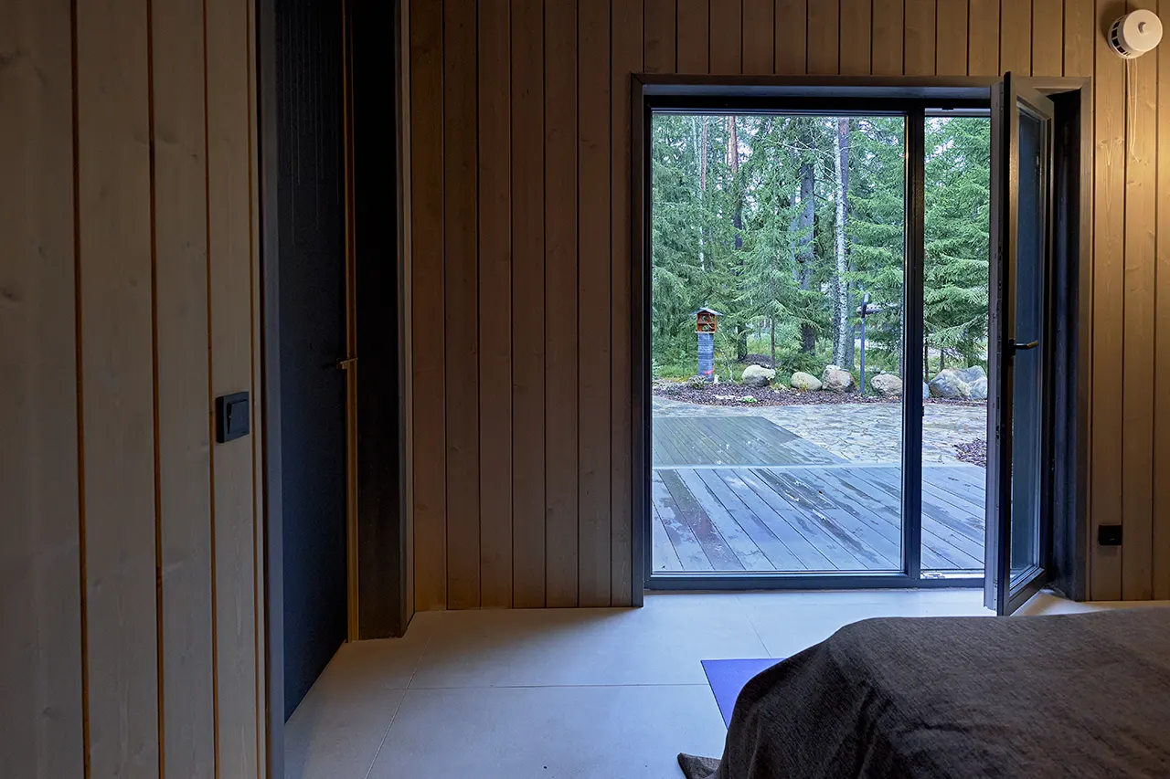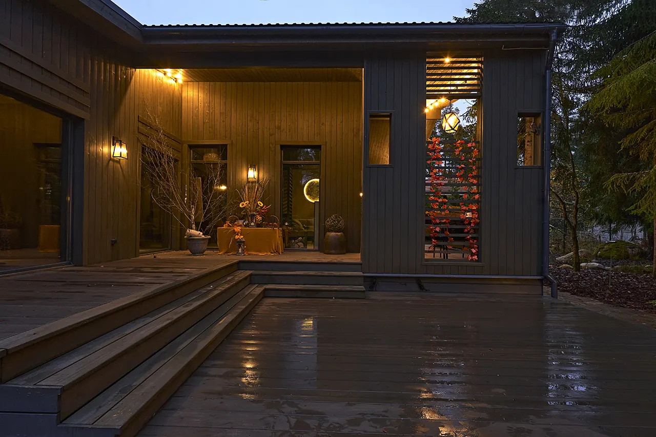 Сегодня в доме комфортно проживает семья с питомцем. Стильный дизайн с эстетичными панорамными окнами и видом на красивый сад, сауна внутри дома, большая крытая терраса создают атмосферу хорошего загородного отеля, из которого можно никогда не уезжать.