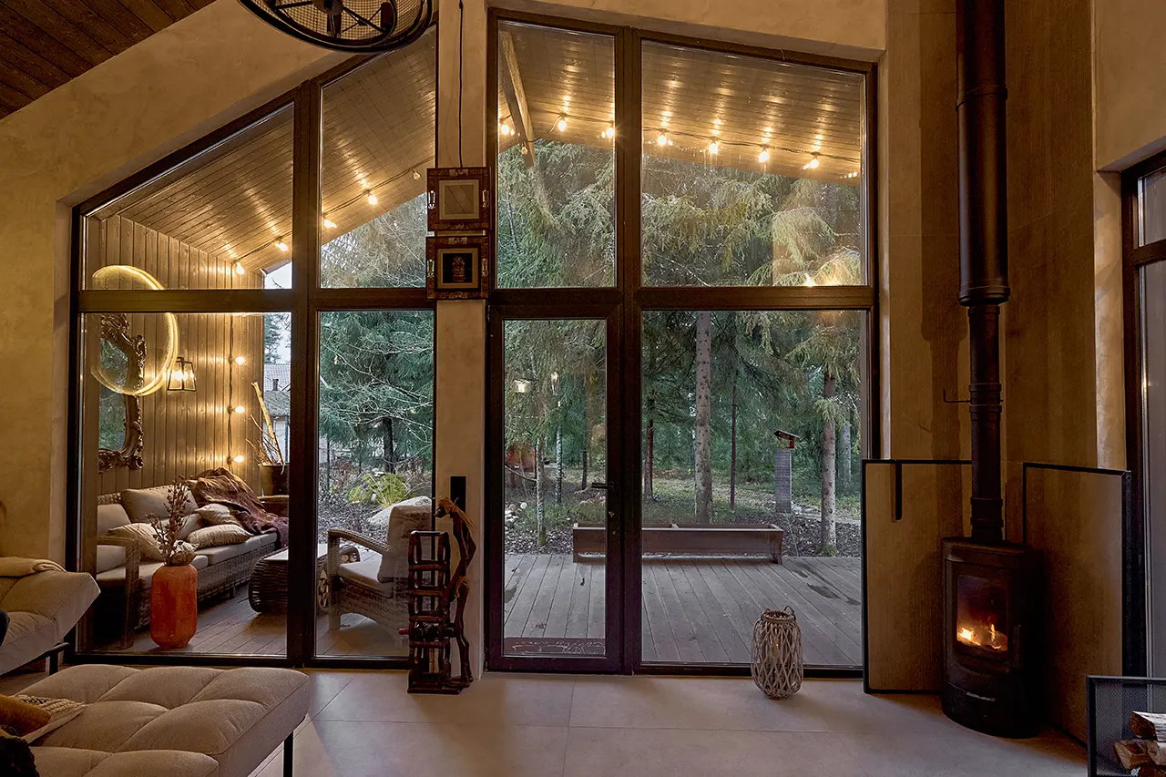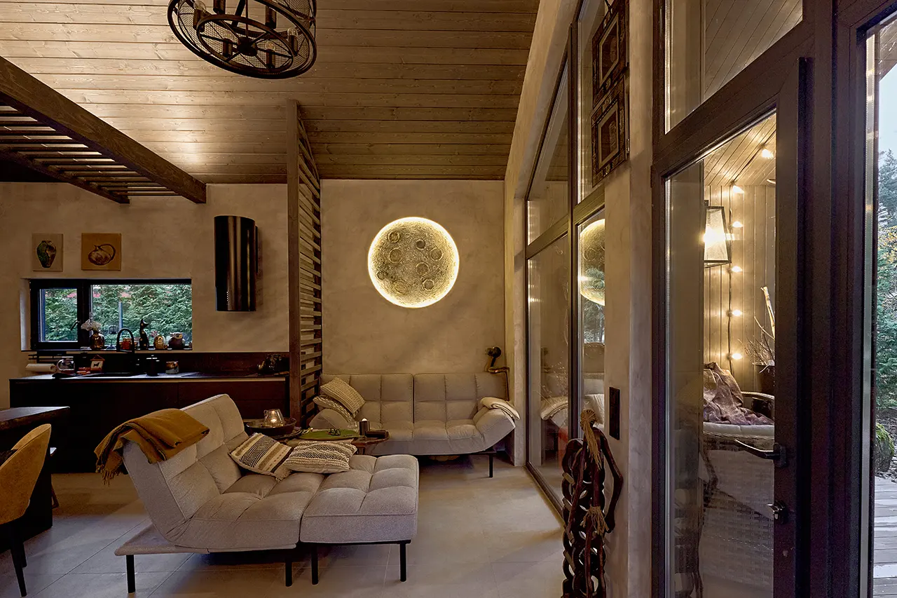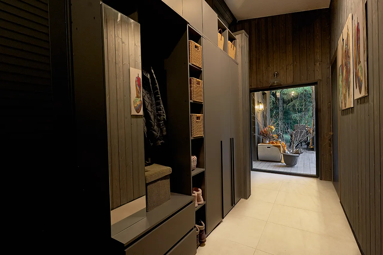 Сегодня в доме комфортно проживает семья с питомцем. Стильный дизайн с эстетичными панорамными окнами и видом на красивый сад, сауна внутри дома, большая крытая терраса создают атмосферу хорошего загородного отеля, из которого можно никогда не уезжать.