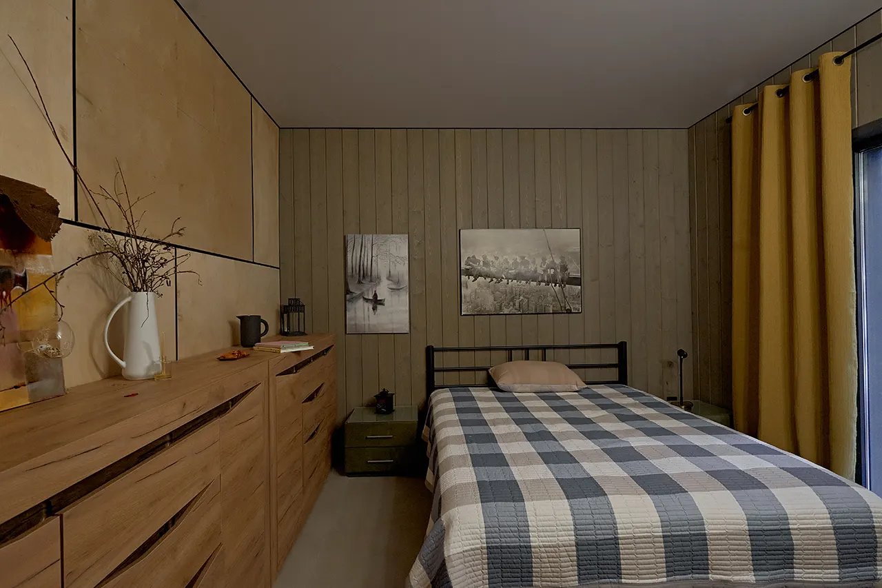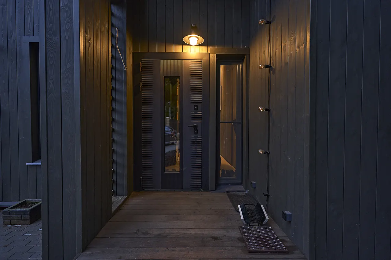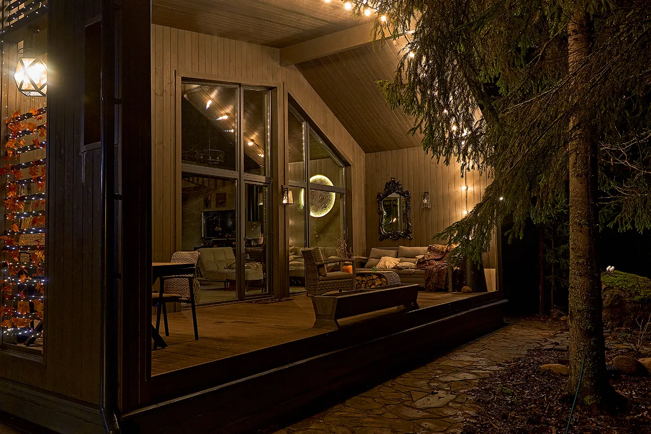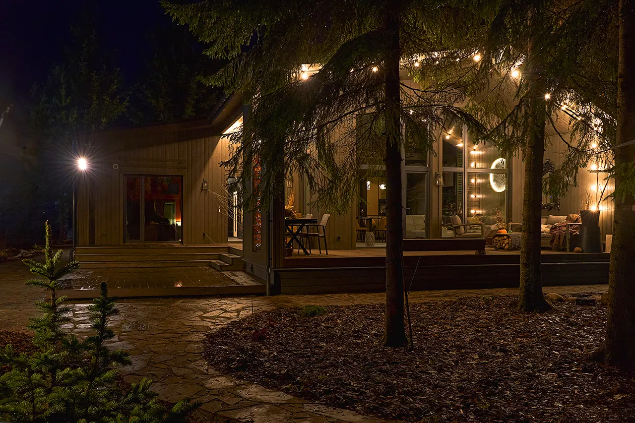 Коммуникации и качественное утепление позволяют жить в барнхаусе на постоянной основе. Владельцам годами не придется вспоминать о ремонте, ведь для строительства использовались надежные материалы. При этом мы подбирали решения с наиболее выигрышным соотношением цены и качества. Например, кровля выполнена из профлиста. Материал бюджетный, но практичный, износостойкий и вписывается в концепцию лаконичной эстетики барнхауса.