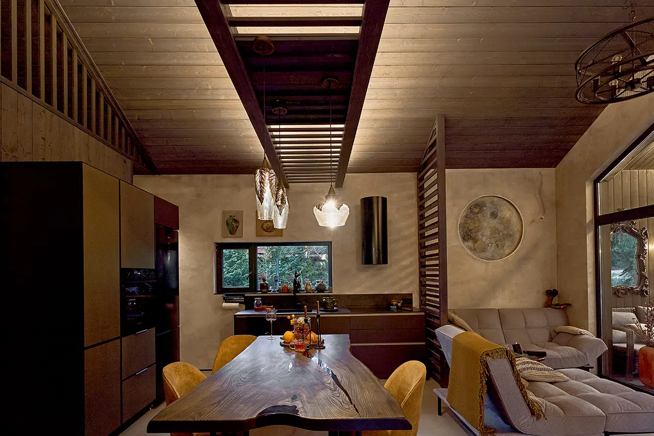 Для каждого предусмотрено достаточно места. Просторная кухня-гостиная стала местом уютных семейных посиделок и встречи гостей. Принимать близких за городом удобно, ведь в доме есть дополнительная спальня и два санузла.
