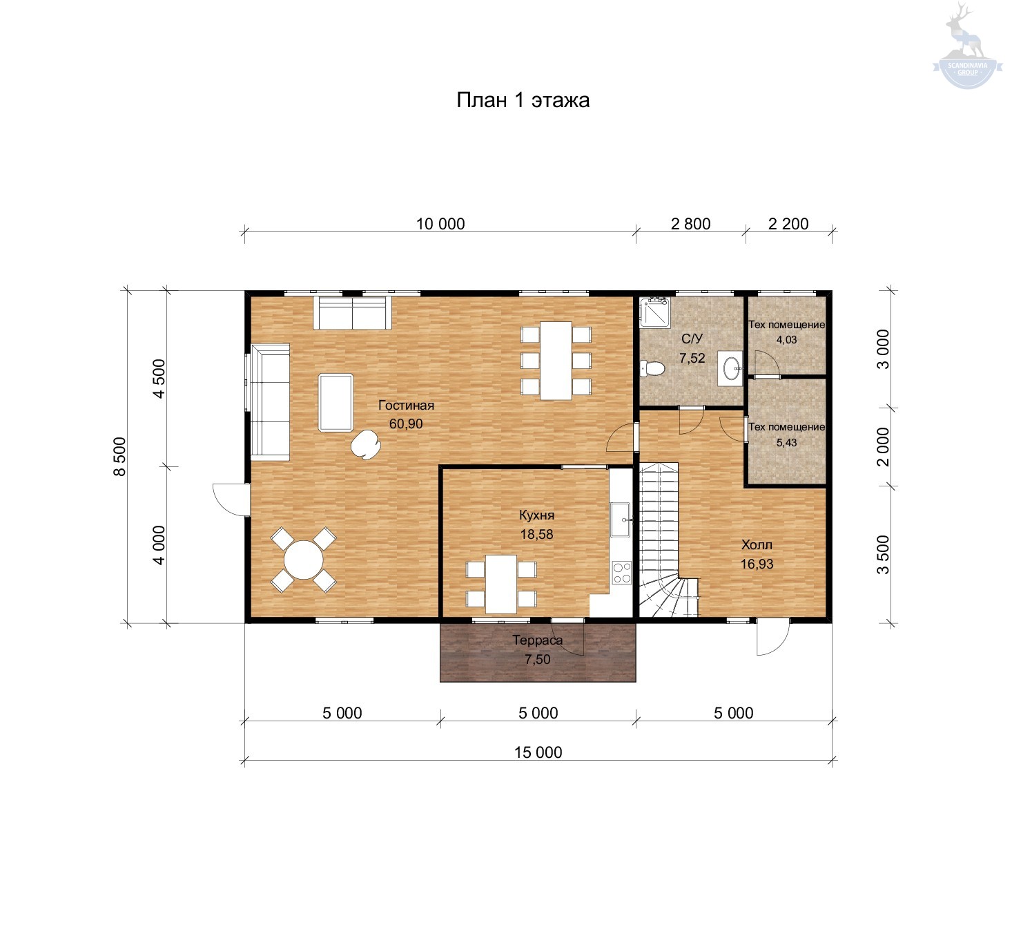 Внутренние помещения первого этажа включают просторную гостиную и отдельную от нее кухню с выходом на террасу — идеальное место для приема гостей и проведения семейных мероприятий в теплые сезоны года. Также тут расположены санузел с душевой кабиной, технические помещения и холл с межэтажной лестницей. На втором этаже дома вы найдете 3 функциональные спальни, санузел и небольшую кладовку. При этом две из спальных комнат имеют встроенные гардеробные, а третья – выход на балкон площадью 7,5 м², где вы сможете дышать свежим воздухом и наслаждаться красивыми видами на окружающую природу.