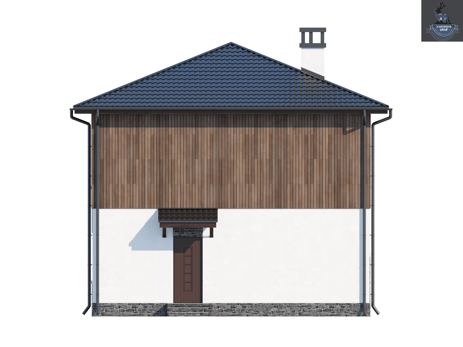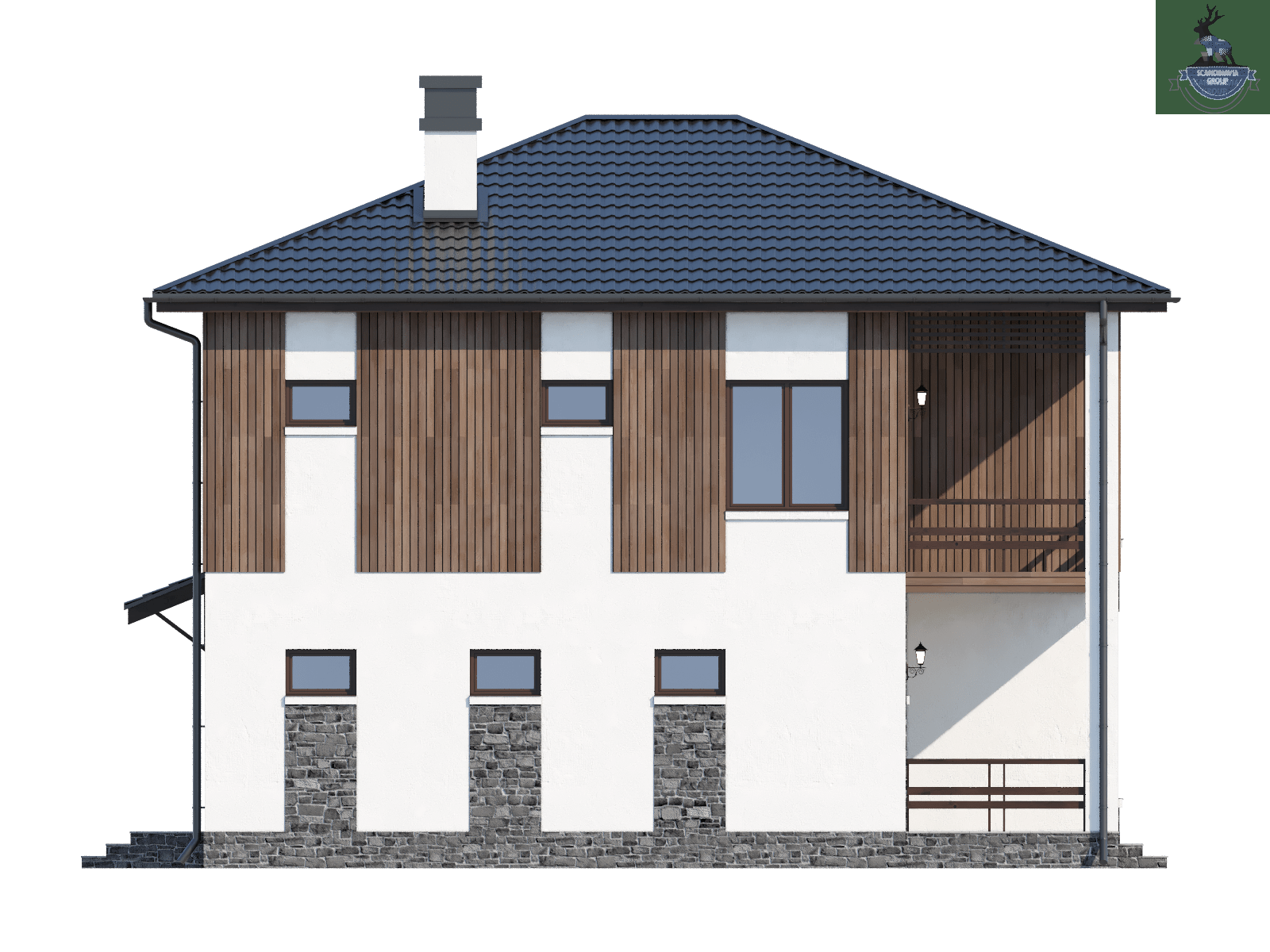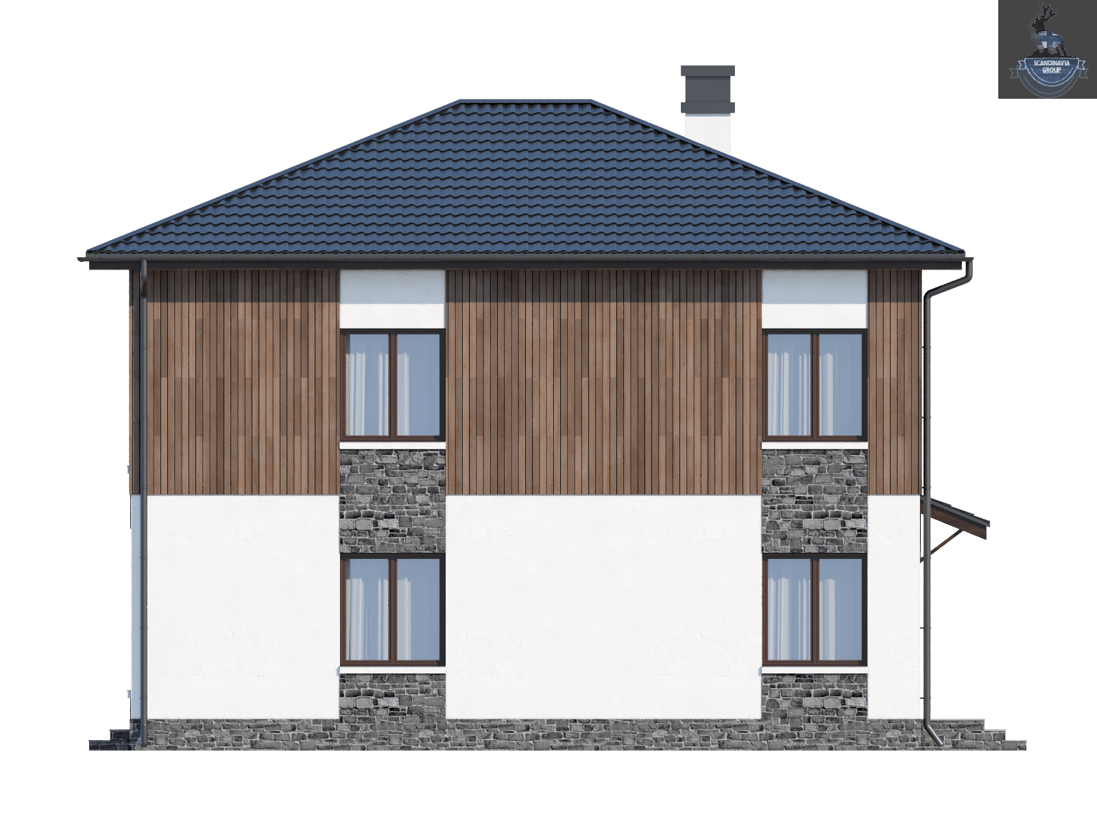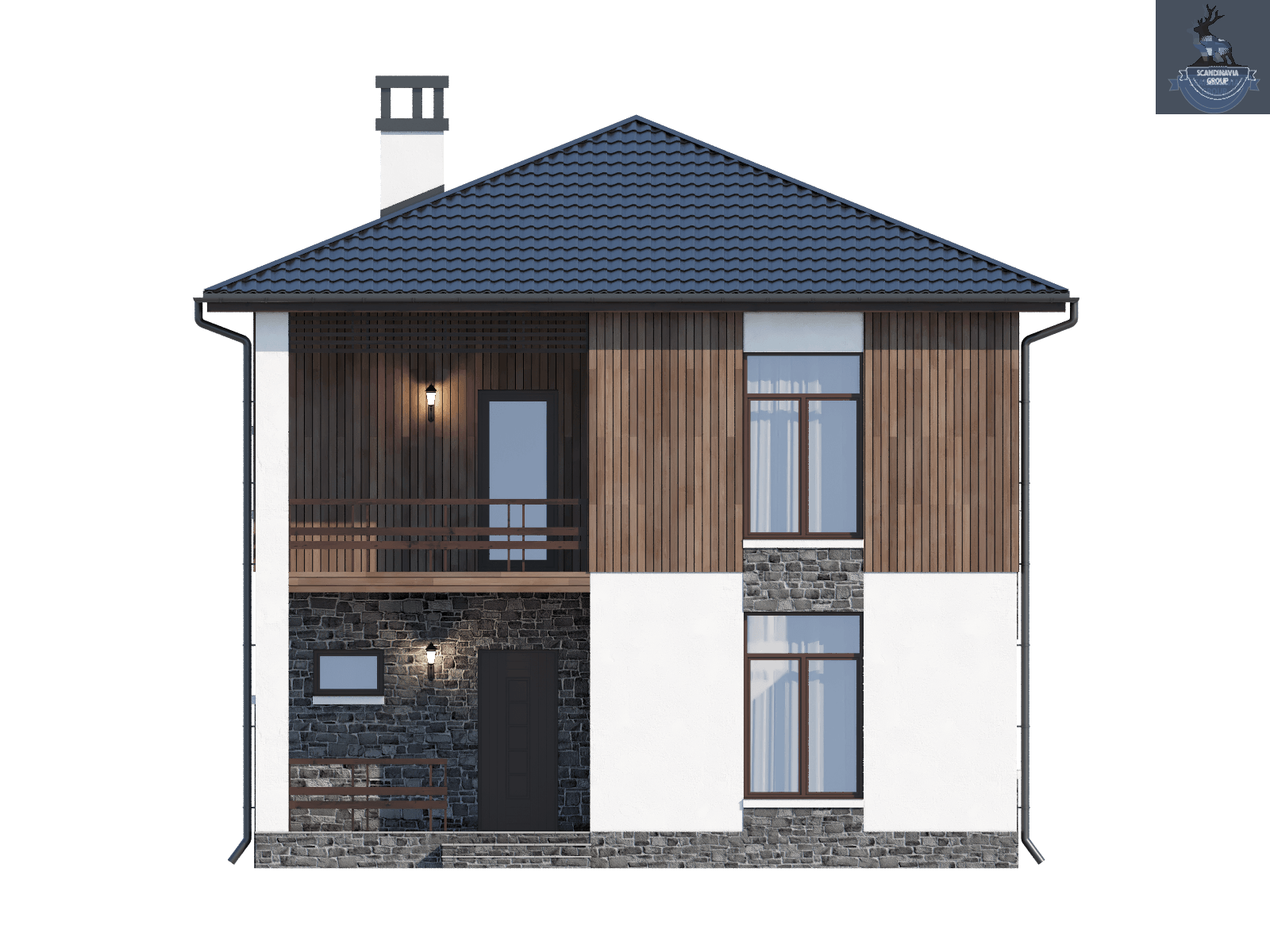Проект каркасного дома КД-730 — это уютный двухэтажный коттедж в скандинавском стиле с классической вальмовой крышей, необычной внешней отделкой, внутренними помещениями правильной формы. Проектная площадь здания составляет 189 м². В доме есть все необходимые для комфортного проживания семьи из 3-6 человек