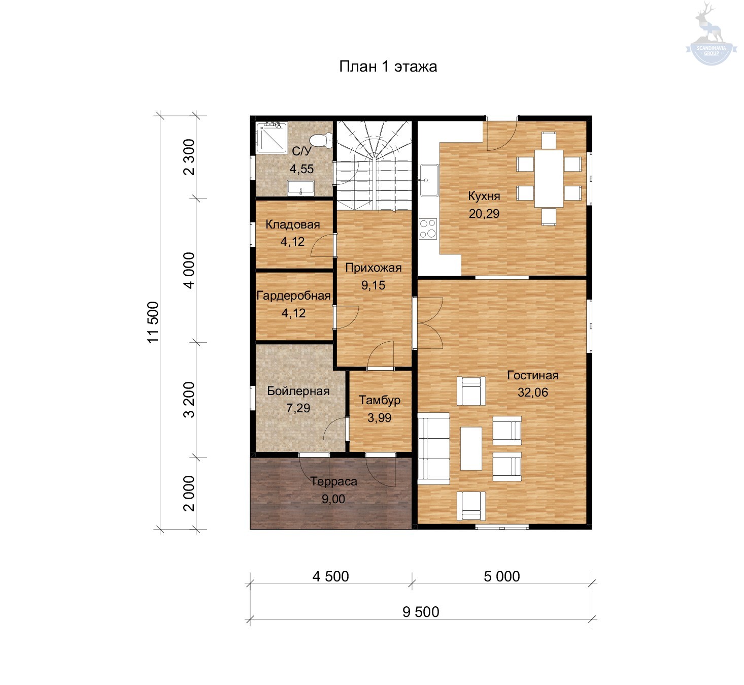На первом этаже располагается просторная гостиная, где вы сможете создать неповторимую атмосферу для приема гостей и организации досуга. Здесь же владельцев ждет кухня, площадь которой позволит не только хранить продукты и готовить, но и собирать всю семью за одним столом. Кроме того, тут имеется бойлерная, санузел с душевой кабиной, кладовая для организации хранения предметов быта и гардеробная, где вы сможете разместить верхнюю одежду и обувь. А главное преимущество первого этажа — это терраса, на которой будет удобно проводить время на свежем воздухе.