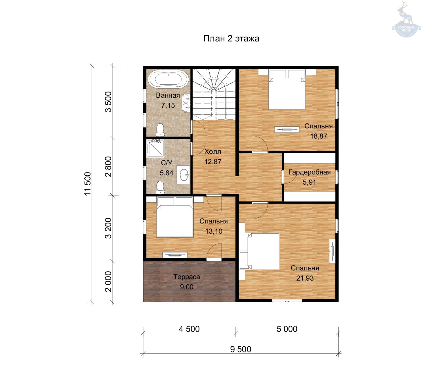 На втором этаже дома располагаются три уютные спальни. Также на этом этаже есть санузел. Великолепное дополнение к спальным комнатам — вместительная гардеробная, где разместится повседневная одежда и аксессуары всех проживающих. Изюминка второго этажа – балкон над террасой.