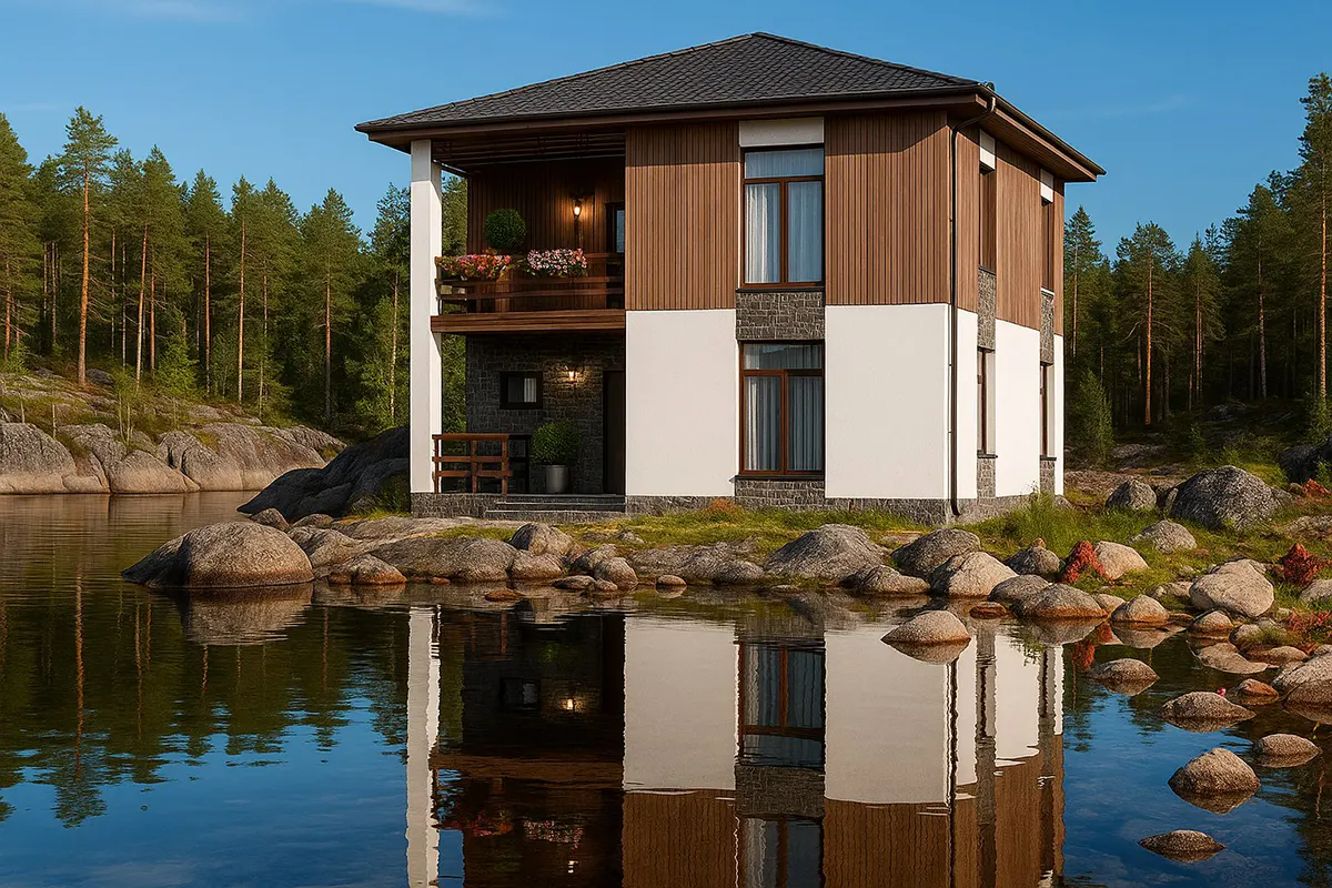 Имитатор бруса «Карельский профиль», окрашенный в производственных условиях кликфальц/штукатурка по проекту + ветро теплоизоляционными плиты БЕЛТЕРМО TOP 25мм., шип-паз, устройство водоотливной металлической планки по периметру дома, оконные отливы, наличники окон и дверей. Гидроизоляция террас, балконов.
