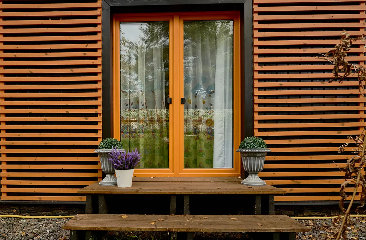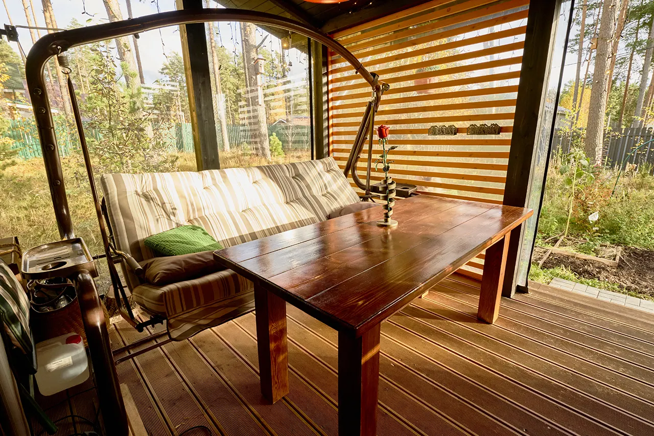 Из коттеджа открывается прекрасный вид на величественные высокие сосны. Благодаря наличию панорамных окон, владельцы в любую погоду наслаждаются живописным пейзажем, находясь в тепле и уюте. В хорошую погоду они также могут отдохнуть на террасе.