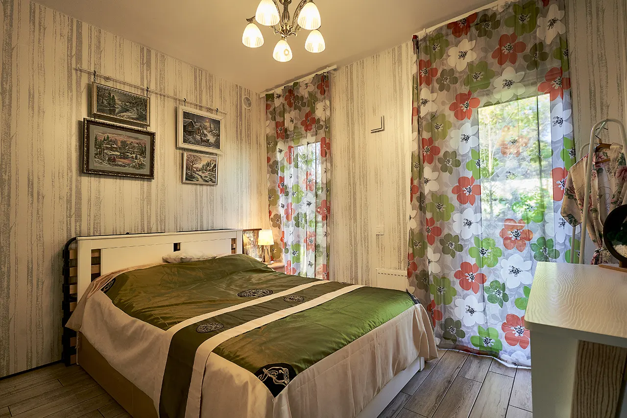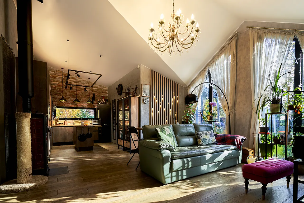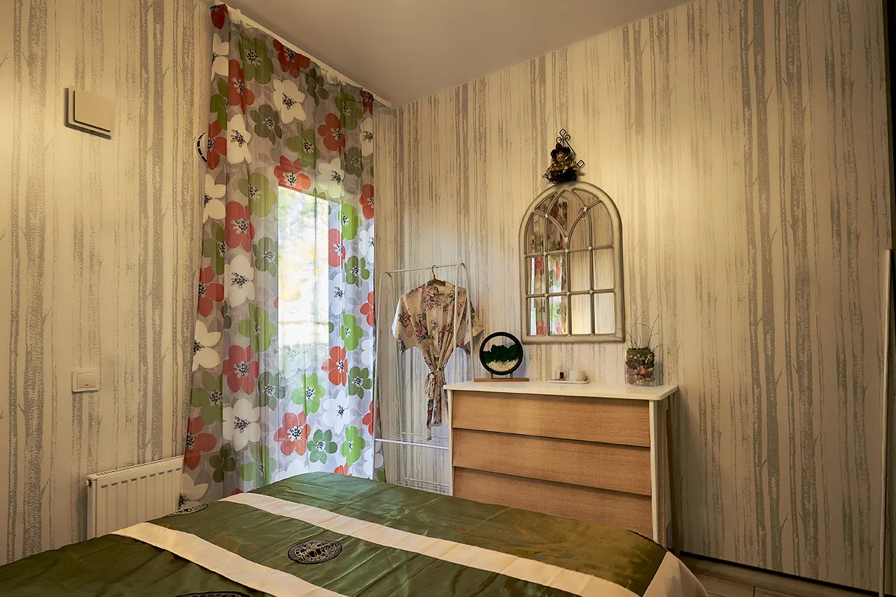 Внутри здания обустроены небольшие спальни, просторная зона отдыха, совмещенная с кухней, санузел. В помещениях выполнена внутренняя отделка, поэтому владельцы смогли быстро заселиться в дом.
