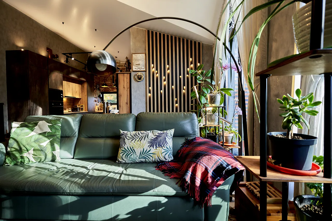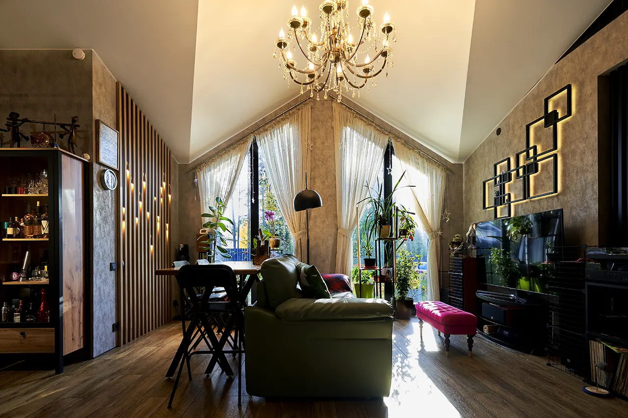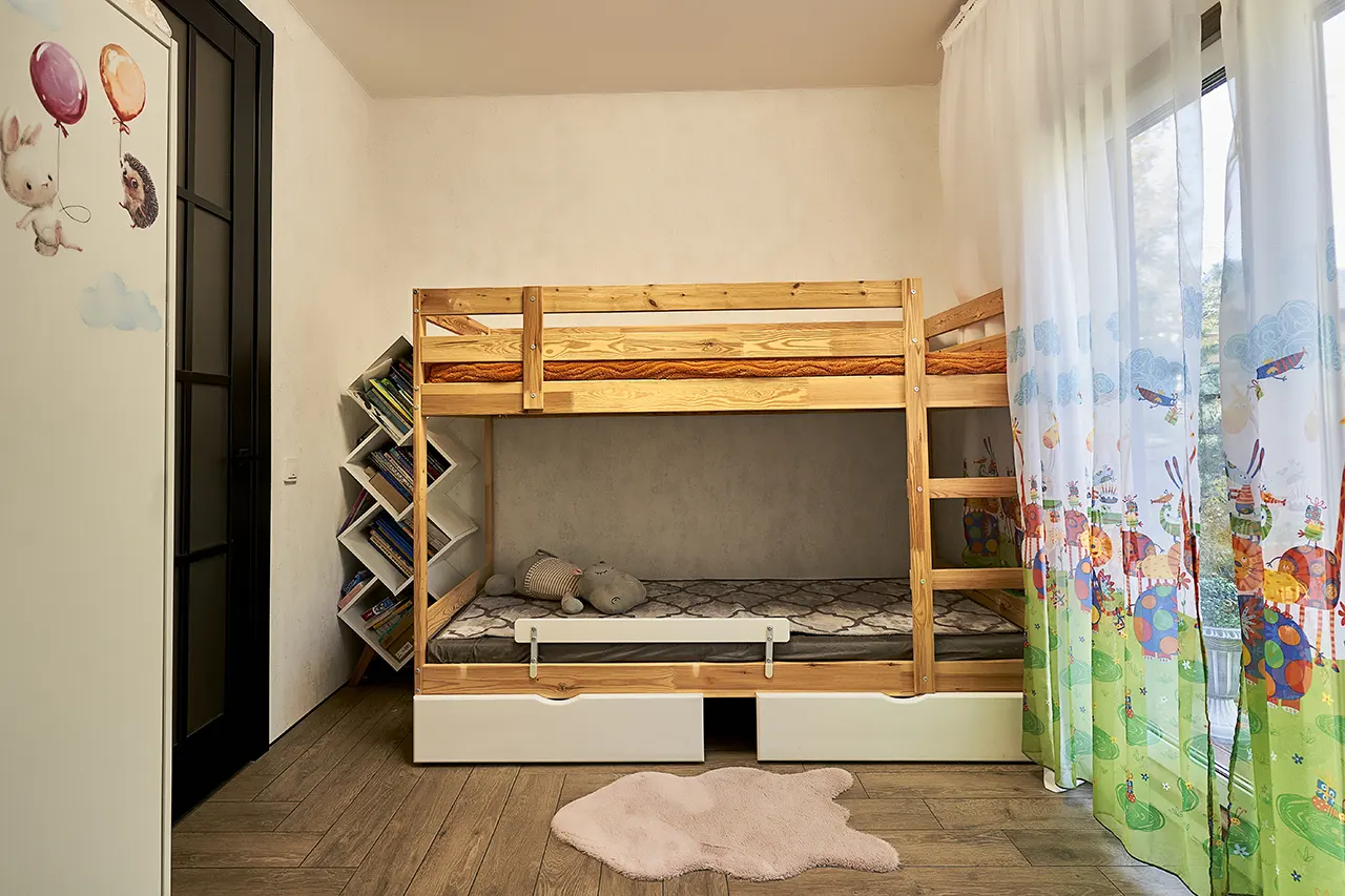 Внутри здания обустроены небольшие спальни, просторная зона отдыха, совмещенная с кухней, санузел. В помещениях выполнена внутренняя отделка, поэтому владельцы смогли быстро заселиться в дом.