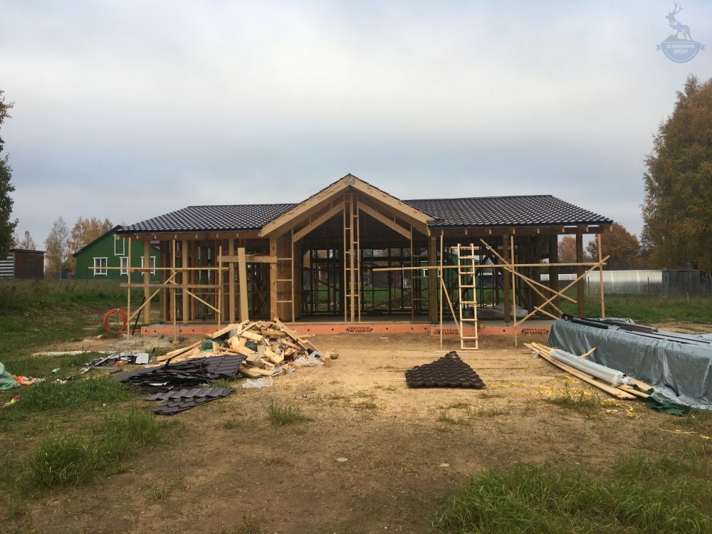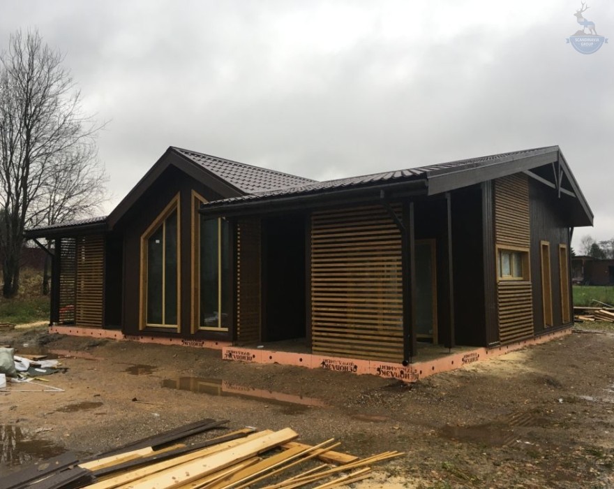 Одноэтажный каркасный дом площадью 104,8 квадратных метра построен по проекту КД-790 в августе 2021 года. Расположился он в посёлке Окуловка Ленинградской области.
