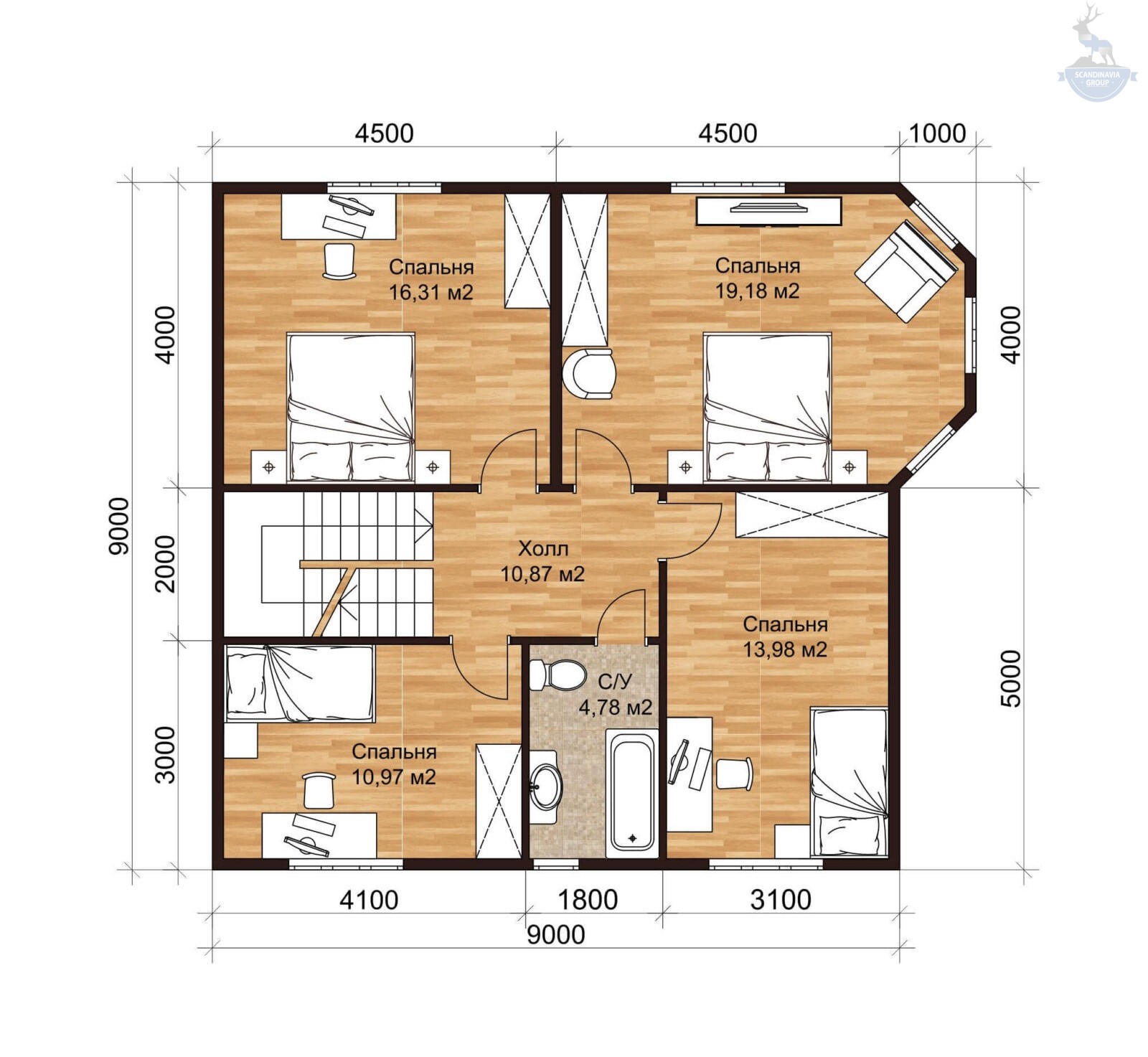 На втором этаже находятся 4 спальни и второй санузел. Эркер в одной из комнат станет дополнительным местом установки кресла для отдыха и чтения книг, организации рабочего стола или обустройства зеленого уголка для зимнего сада. Большие окна эркера пропускают в помещения много естественного света, что сделает любой интерьер особенно светлым и приветливым.